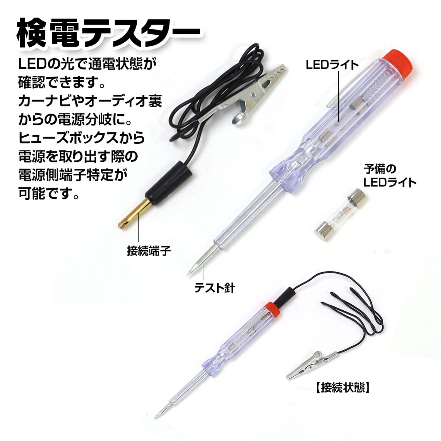 検電テスターや配線ガイド、内張り剥がしなど充実したセット内容となっております。
