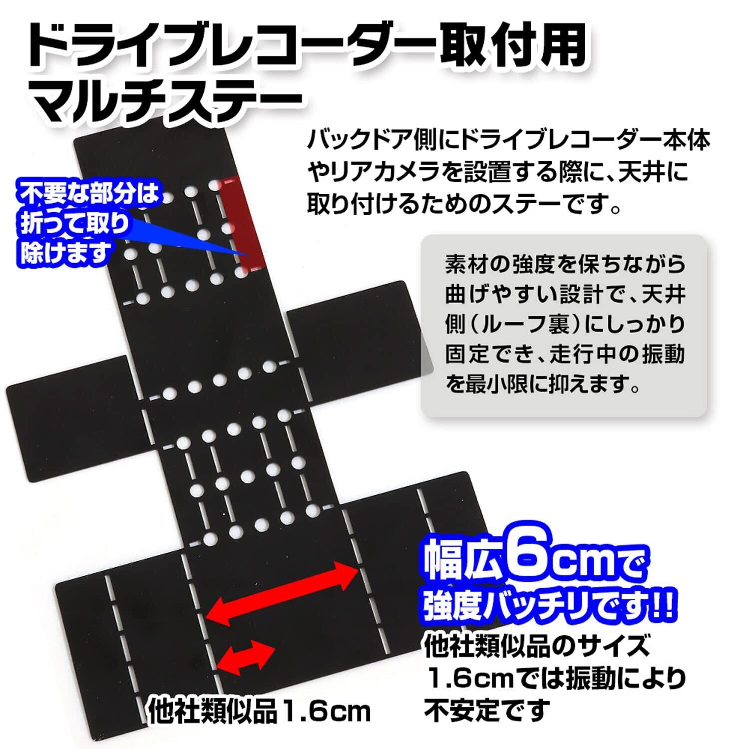 【ドライブレコーダー取付用マルチステー】 バックドア側にドライブレコーダー本体やリアカメラを設置する際に天井に取り付けるためのステー。 素材の強度を保ちながら曲げやすい設計で、天井側(ルーフ裏)にしっかり固定でき、走行中の振動を最小限に抑える。 天井に設置することで、難しいリアハッチ通線作業が必要あなし。 また、バックドアを開けた時でもドライブレコーダーのカメラアングルが変わらないメリット。