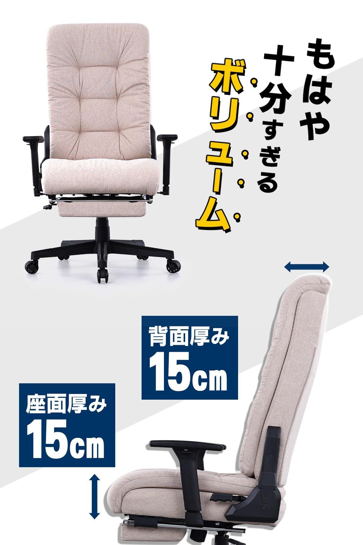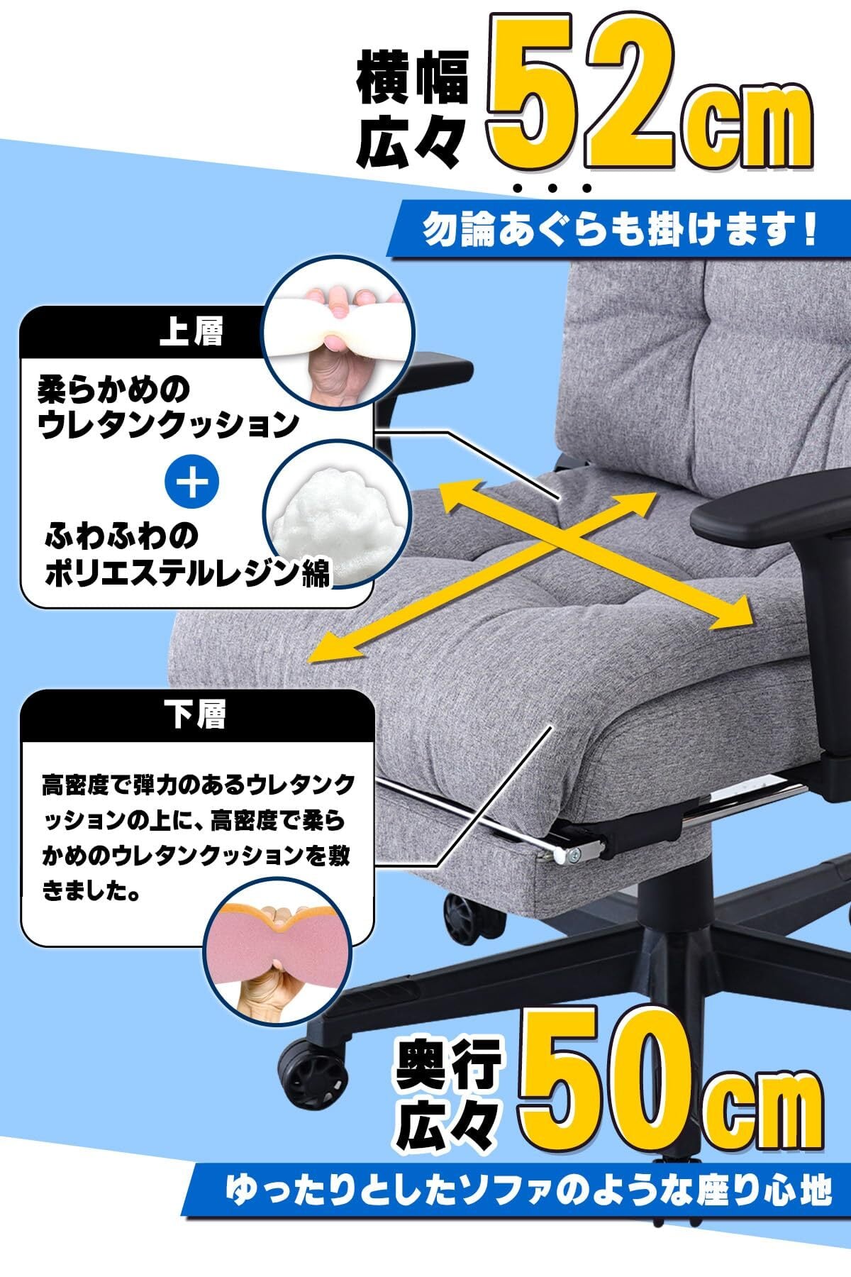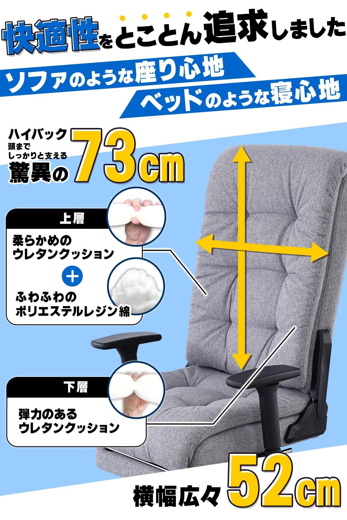【心地良さをとことん追求(1)】①座面は程よい弾力と柔らかさの高密度高反発ウレタンを下層に敷き、上層に柔らかめの高反発ウレタンとフワフワのポリエステルレジン綿を使用。座面幅は広めの52㎝、ゆったりと座れます。②背面は下層は柔らかめの高反発ウレタン、上層は柔らかめの高反発ウレタン+フワフワのポリエステルレジン綿を使用。高さ73㎝の超ハイバックが快適に頭を支えます。③リクライニング170度、収納式フットレスト搭載、ベッドのように体を仰向けにして寝れます。④ロッキング機能搭載、ゆりかごのようにゆらゆらと揺らせます。