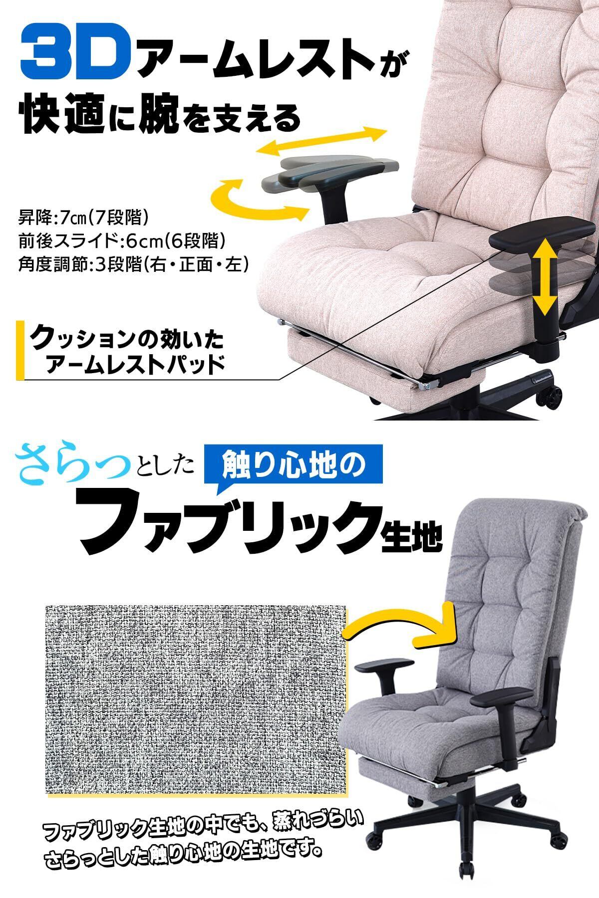 【心地良さをとことん追求(2)】⑤ヘッドレスト付属、フワフワのポリエステルファイバー綿が入ったヘッドレストがお好みの位置で快適に頭を支えます。⑥3Dアームレストがお好みの位置で肘を支えます。⑦静音で滑らかな滑りのPUキャスター搭載。⑧さらっとした触り心地のファブリック生地を使用。