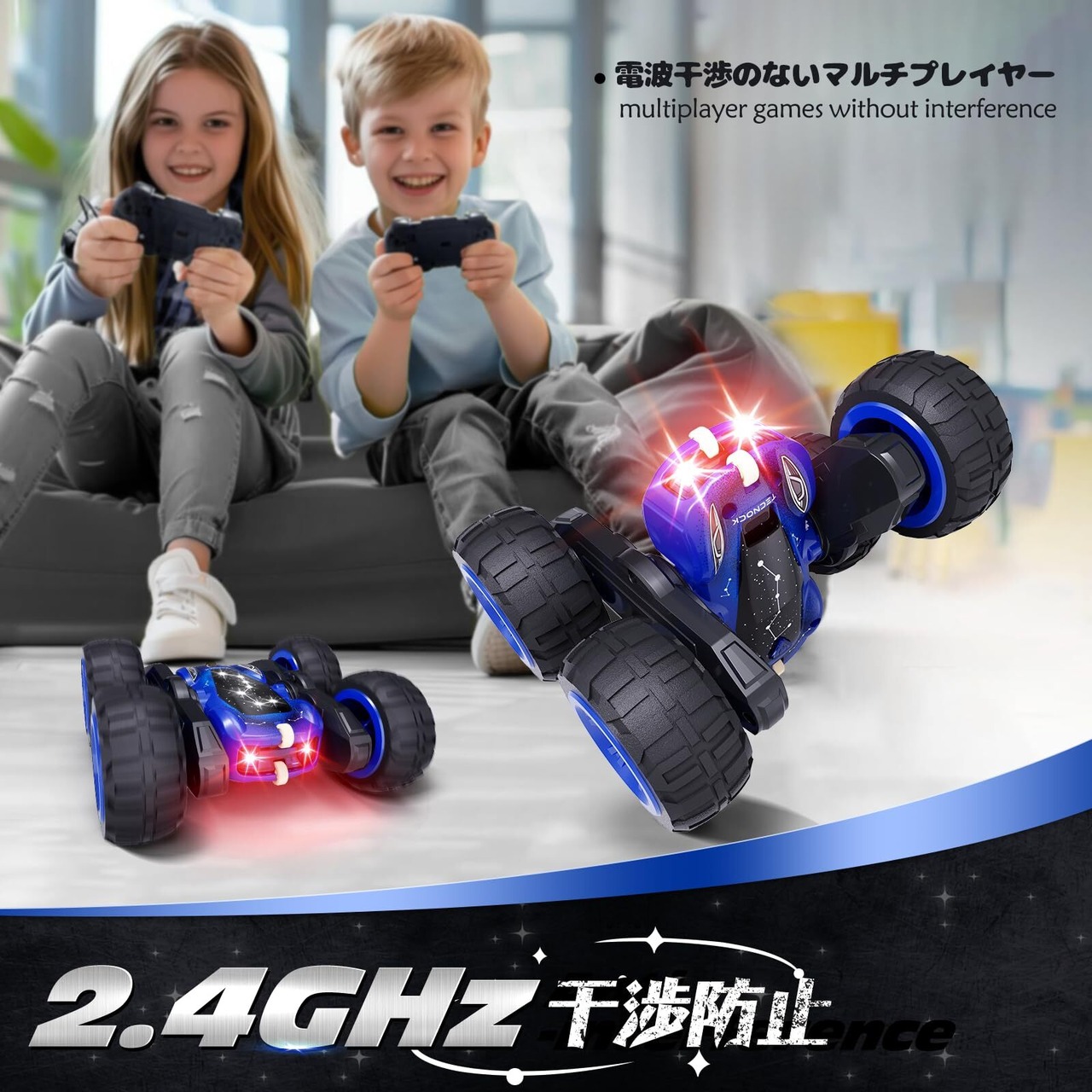 Tecnock ラジコンカー 子供向け USB Type-C直接充電式 スタントカー 360度回転 両面走行 テクノック ラジコン オフロード 4WD四輪駆動 RCカー 2.4GHz おもちゃ 車 男の子 誕生日 贈り物 プレゼント (ブルー)