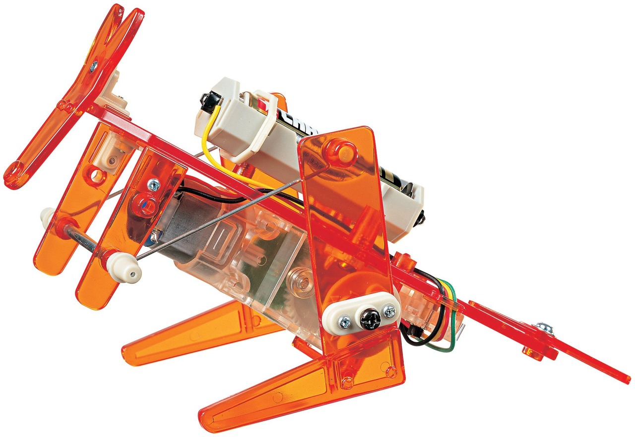 胴体や足はクリヤーオレンジ、ギヤボックスやスイッチはクリヤーパーツですから、動きのしくみがよくわかるのもポイントです。