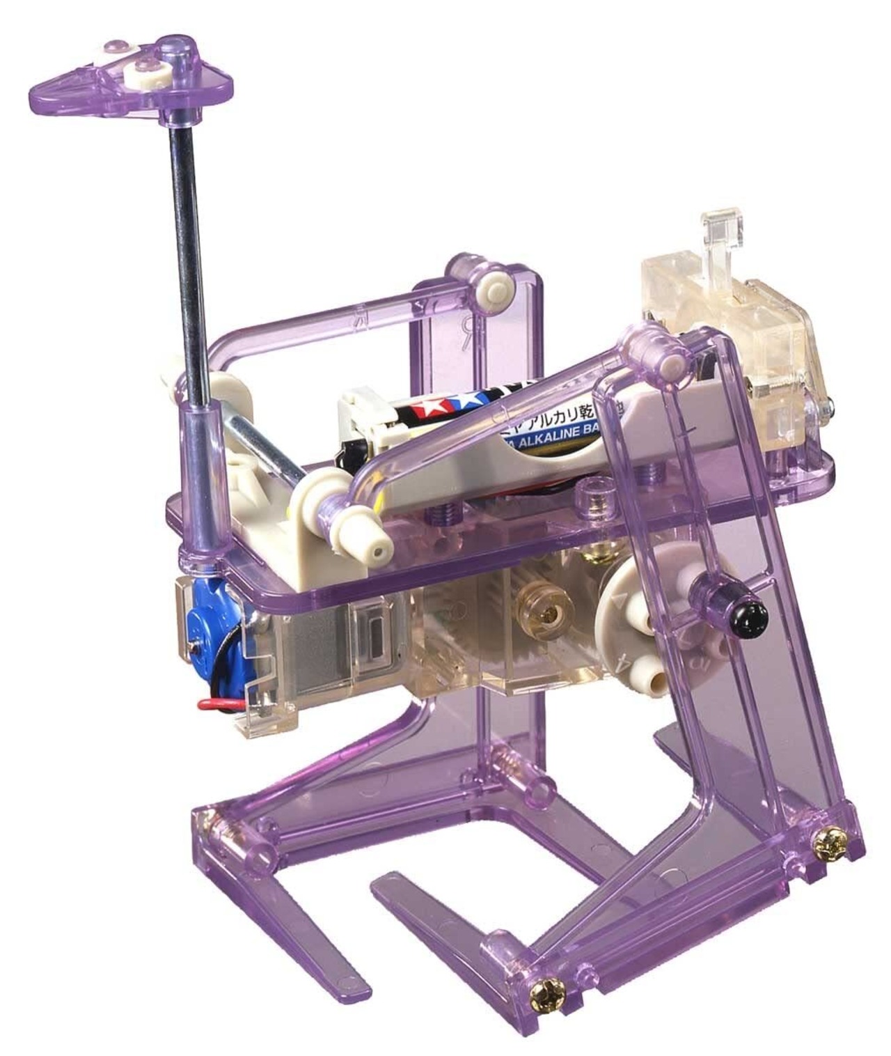 モーターの回転運動をギヤボックスで減速し、クランクプレートを使って足に動きを伝えます。