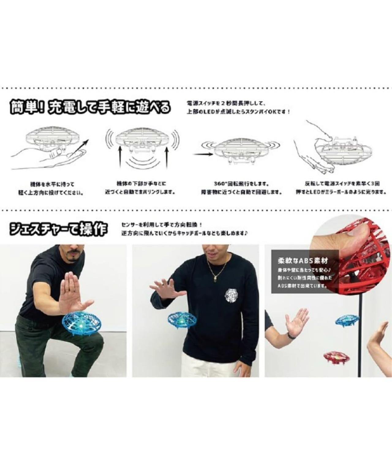 裏面の電源スイッチを長押ししてください(赤青緑に点滅してONを確認)*光の色を楽しむには:その後1回押すと青色に、もう1回押すと緑色に、逆さにして素早く3回押すとミラーボールのように点滅した光方に変わります(戻すには1回電源OFFに)1,両手を前に掲げて機体を軽く上方向に投げてください。2,手や壁など障害物に近づくと自動で回避して飛び続けます。3,機体の下部に手などの障害物が近づくと自動でホバリングして一定の高さまで上がります。4,機体動作を止める場合は、機体をつかんだ後逆さまにします。始動同様に裏面の電源スイッチを長押ししてライトが消えたらOFFになります。*必ず備え付けのUSBケーブルをご使用してください。*約40分で充電完了(充電時につく赤いライトが消灯します)