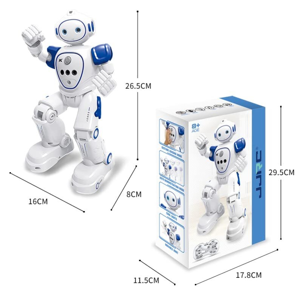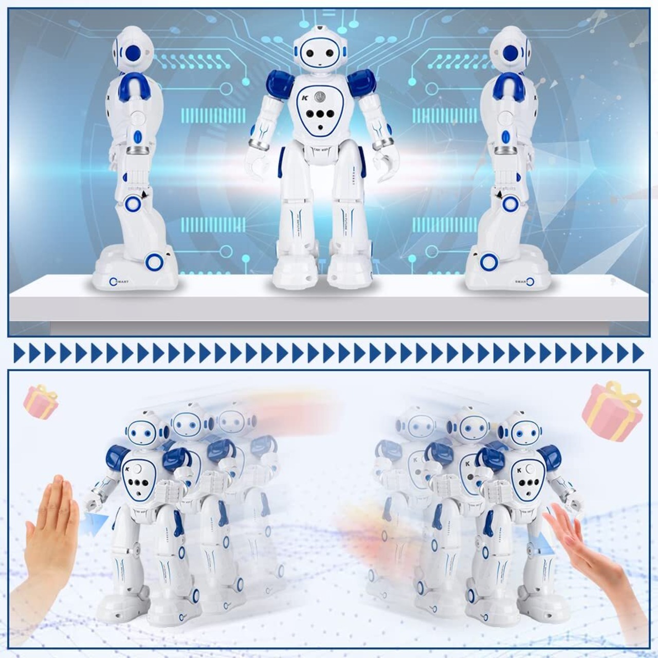 【2つ制御モード】 このスマートロボットを制御するには、リモコンまたはジェスチャーを使用することができます。本体には、ジェスチャー信号を認識する精密な赤外線センシング機能が搭載されています。リモコンがなくても、ジェスチャーコマンドを使用してロボットの前方、後方、左折、右折を制御し、さまざまなアクションを完了することができます。