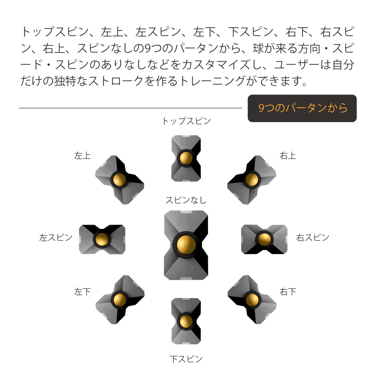 トップスピン、左上、左スピン、左下、下スピン、右下、右スピン、右上、スピンなしの9つのパータンから、球が来る方向・スピード・スピンのありなしなどをカスタマイズし、ユーザーは自分だけの独特なストロークを作るトレーニングができます。