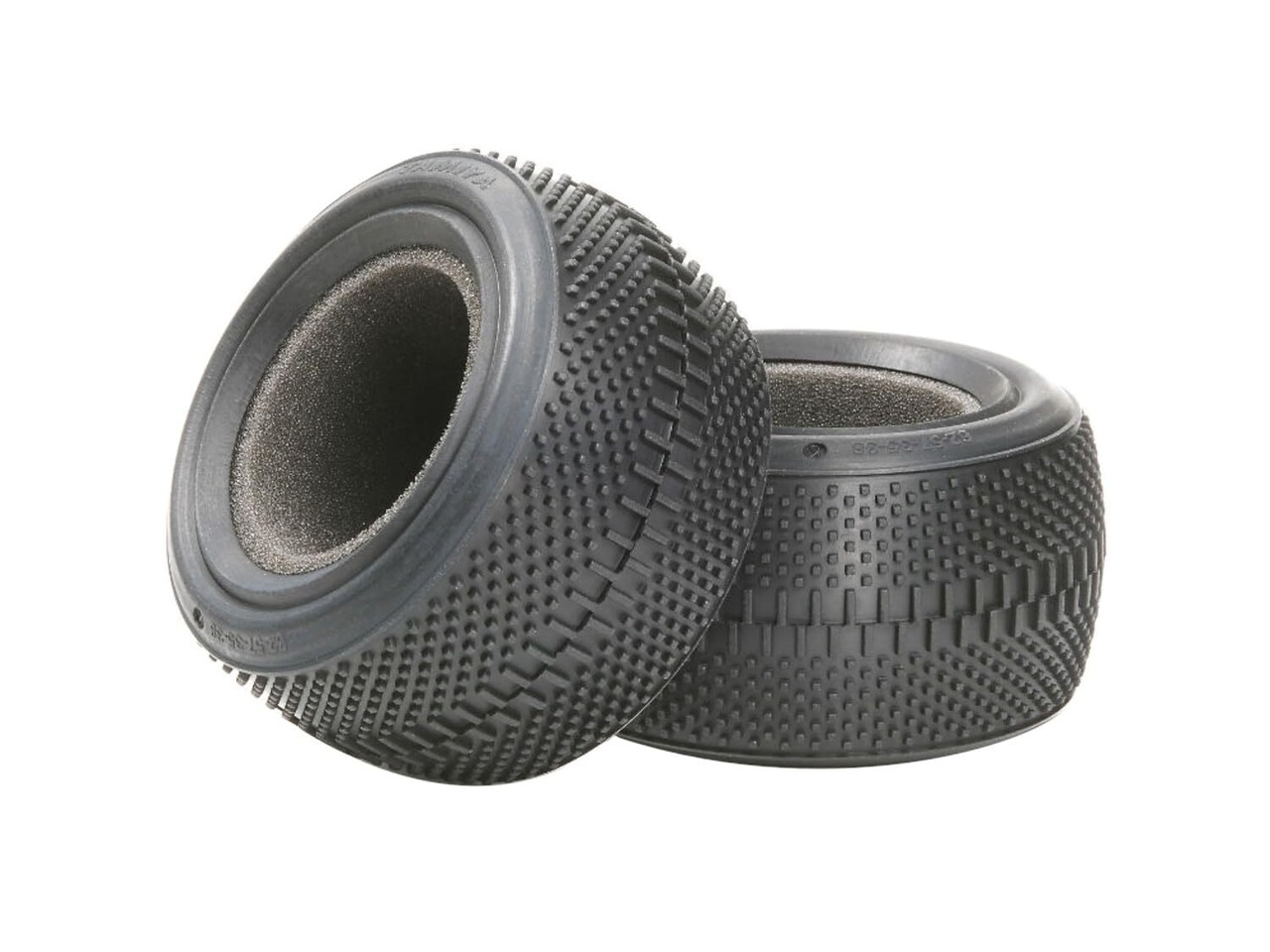 正方形と長方形の2パターンのブロックを配したバギー用リヤタイヤです。オフロードはもちろん、舗装路やカーペット路面でも安定した走行を実現。また、専用のモールドインナーもセットされ、タイヤの変形が少ないためグリップ力が安定しているのも特徴です。内径62mm、幅35mm、外径87mm インナースポンジ付き2本セット。【適応車種・パーツ】DF-03、DB-01キット標準タイヤ 62/35サイズ ホイール SP.1305 DB01 ディッシュホイール (リヤ) 、SP.1321 DB01 ディッシュホイール (リヤ・白) 、OP.881 オフロード後輪大径ホイール (62/35) 、OP.986 TRF501X リヤディッシュホイール (イエロー・2本) 。