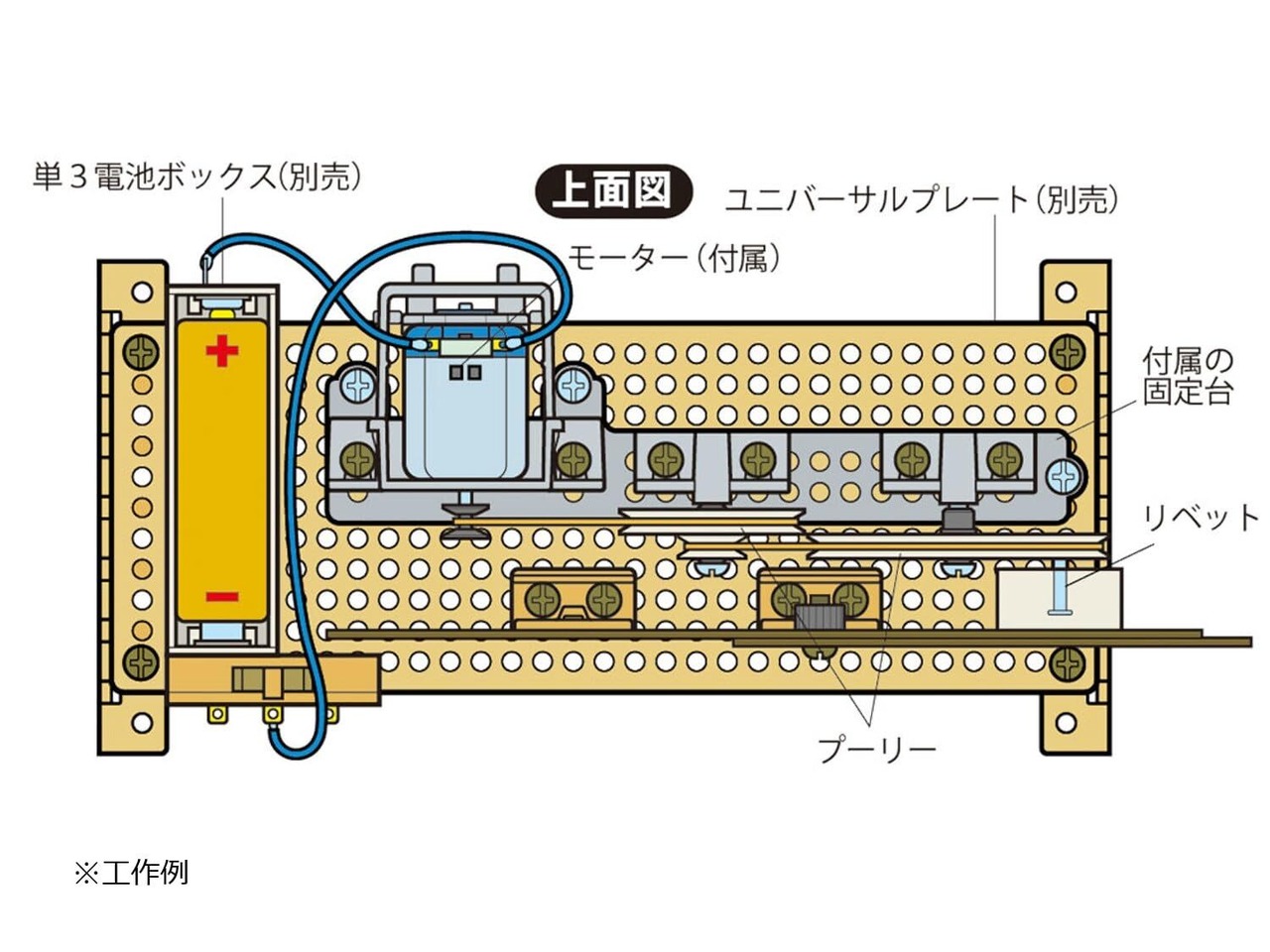 モーターホルダーやプーリーステーは樹脂製ベース上にまとめて取り付けられ、動きの工夫に幅広く使えます。
