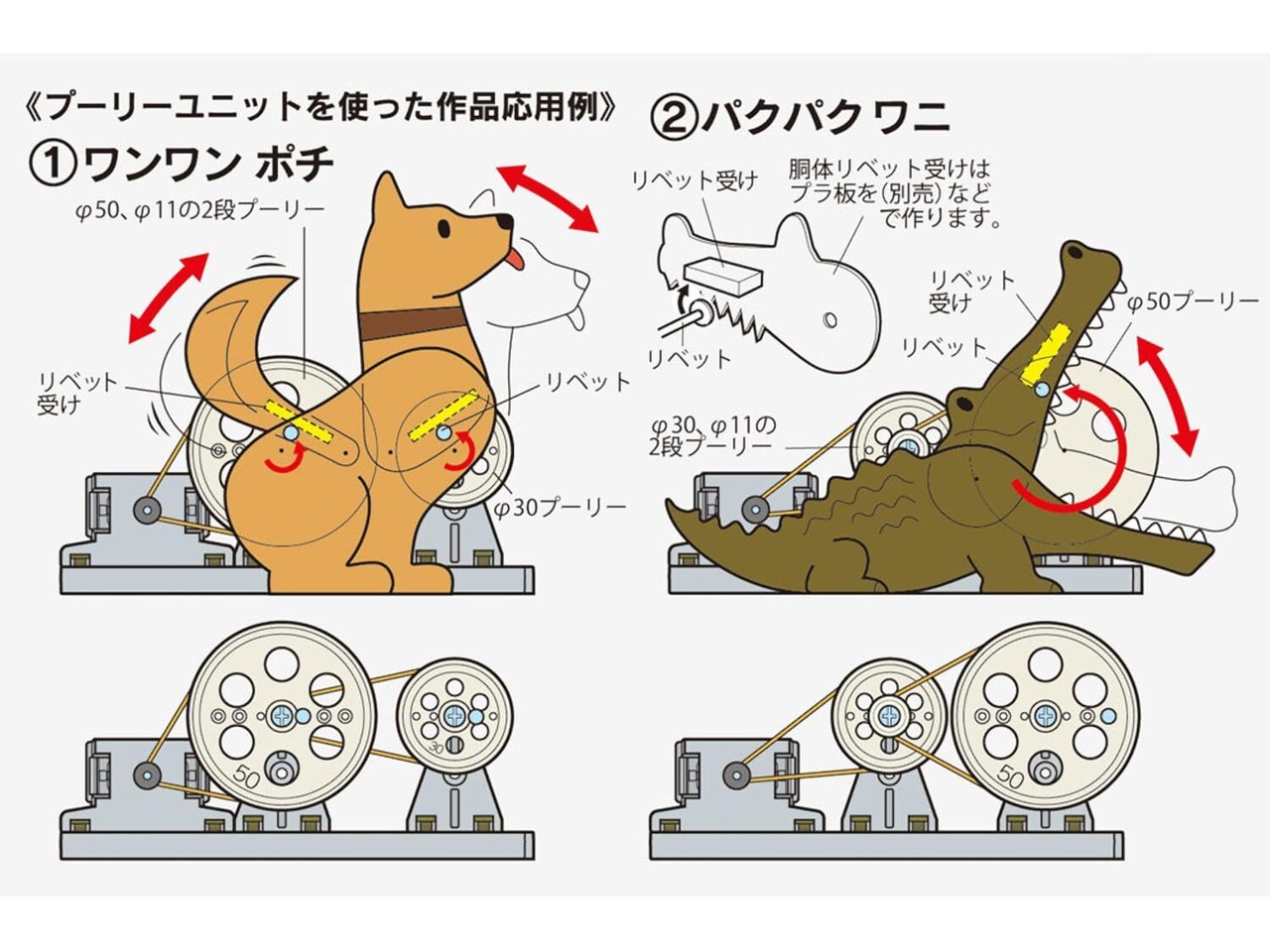プーリーを組み合わせて手軽にパワーユニットが作れます。5種類のサイズのプーリーやブッシュ、糸ゴムなどが入って、工作にあわせてスピードやパワーを変えることが可能。