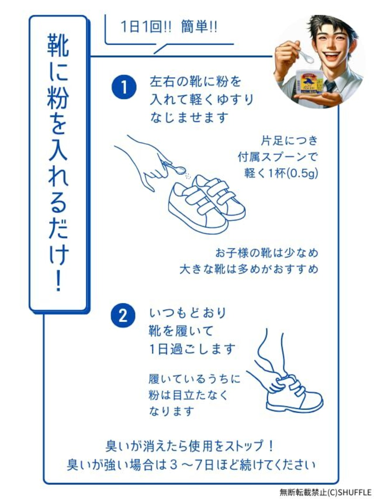 ●付属スプーン1杯(片足分)を、左右の靴に散布します。 ●上記の動作を1ペアの靴に約7日間(1日1回)繰返ますが、連日履かない靴の場合は次回履く時に散布すればOKです。 ●散布日のみ、靴下付着パウダーは払い室内にお上がり下さい。