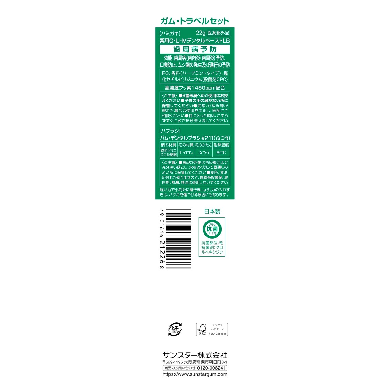 外出先でも効果的な歯周病予防ができます。歯周病の先端を科学して誕生したGUMシリーズのトラベルセットです。歯科医が薦める基本的なブラッシングができる「GUM デンタルハブラシ 211M」と薬用成分CP