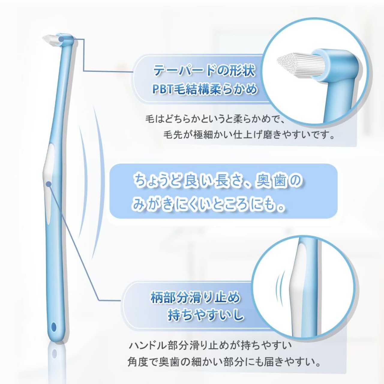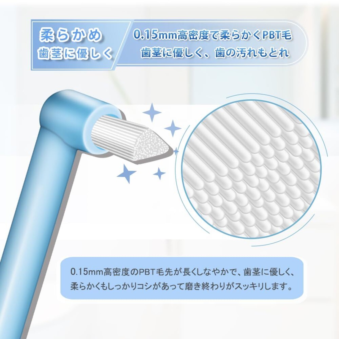 柔らかくて快適に使え、歯茎に優しく、汚れもとれ:最新やわらかい高密度PBT毛を採用、歯間に入りやすく、部分磨きに最適です。柔らかめで圧を感じないから歯茎が弱っている時でも負担なく磨ける。歯茎の弱い人でも安心して使える。