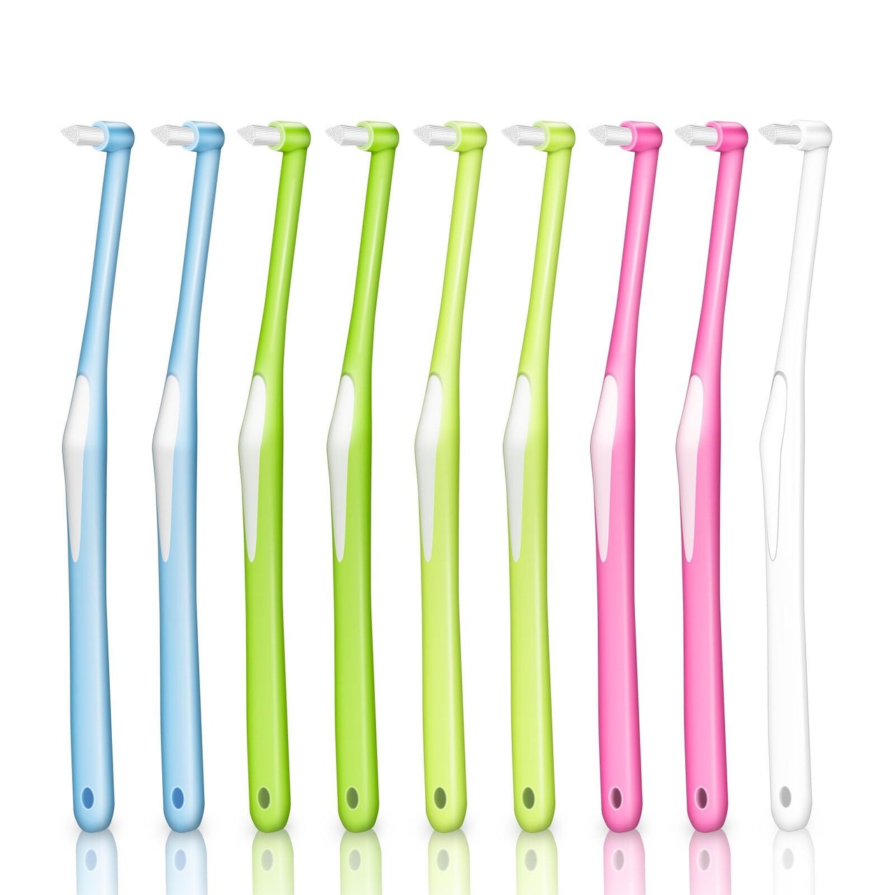 歯ブラシ タフトブラシ 内容:(9本入、5色) やわらかめ ワンタフトブラシ 歯ブラシ 部分磨き 奥歯用 極細 矯正用歯ブラシ。毛の材質:PBT、ハンドル:ポリプロピレン。柔らかので歯茎を傷めることなく、細かい部分の汚れを落としてくれる。