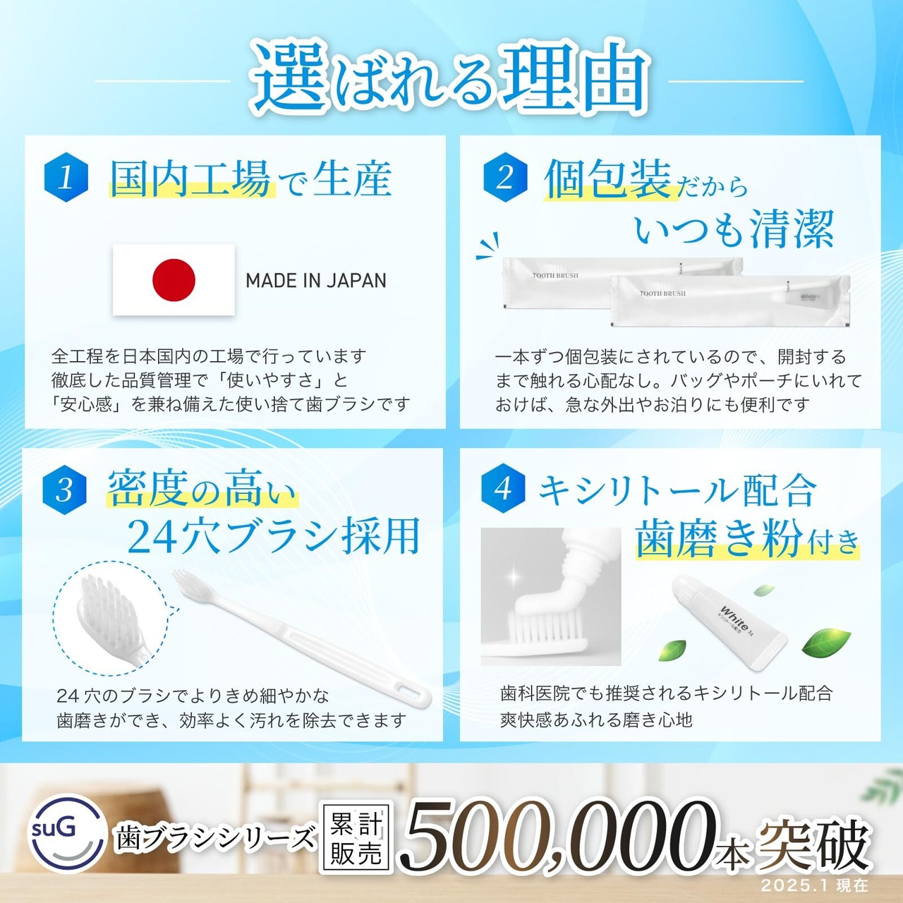 使い捨て歯ブラシ【日本製 個包装で清潔】 20本 まとめ買い 【旅先や出張での必需品】ホテルアメニティ suGオリジナル小分け巾着付