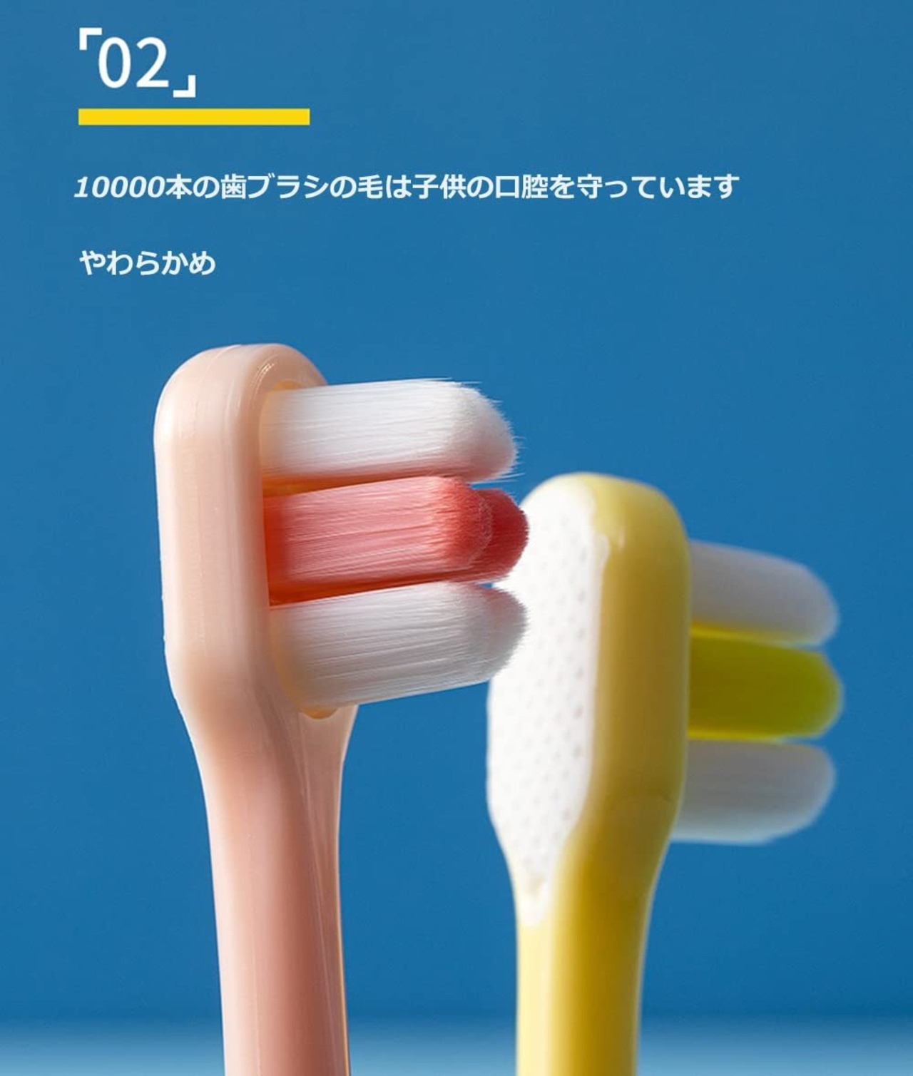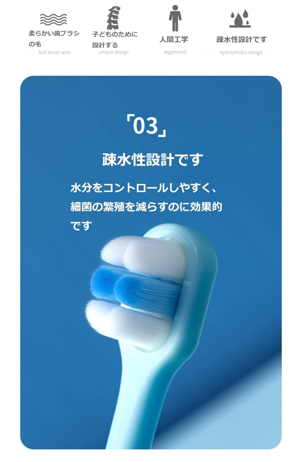 歯ブラシの毛は疎水性の設計を採用して、6つの小さい塊に分けて、更に水分を制御しやすくて、細菌に繁殖しにくくて、更に子供の健康を保管して保護することに利益があります。歯ブラシの毛は直径80マイクロメートル,10,000の細い毛からなります。エクストラソフト歯ブラシの毛ですので,歯を完全に保護し、効果的に歯をきれいにすることができます。
