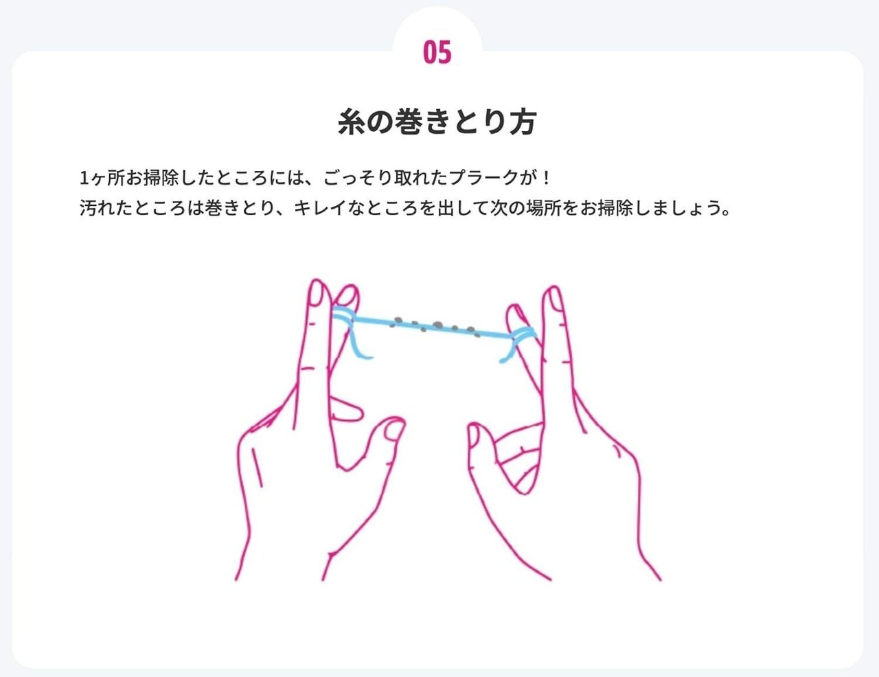 歯周病予防に必要不可欠な縁上・縁下のケア。フロアフロスは、だ液の水分や摩擦によって繊維がフワッと広がるように加工、歯肉縁下に入れても痛みを与えません。