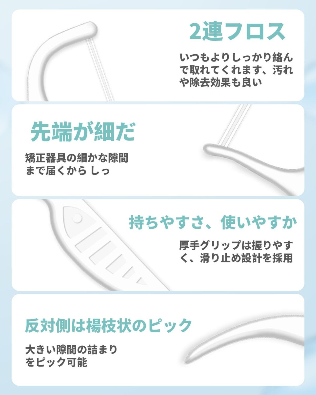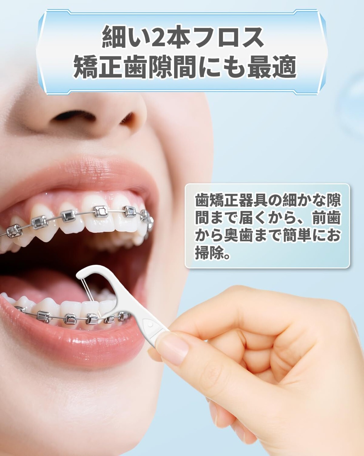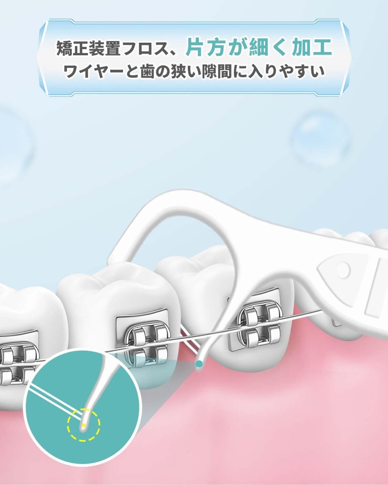 【矯正歯用フロス、使いやすい】ワイヤー矯正中でもそのまま使える特殊形状! 片側を細く加工した先端がのフロス、歯と矯正ワイヤーの狭い隙間にもスムーズに通ります。矯正器具の隙間までしっかりと掃除できます、ワイヤーの裏側までケア、矯正期間中のオーラルケアをサポートします。