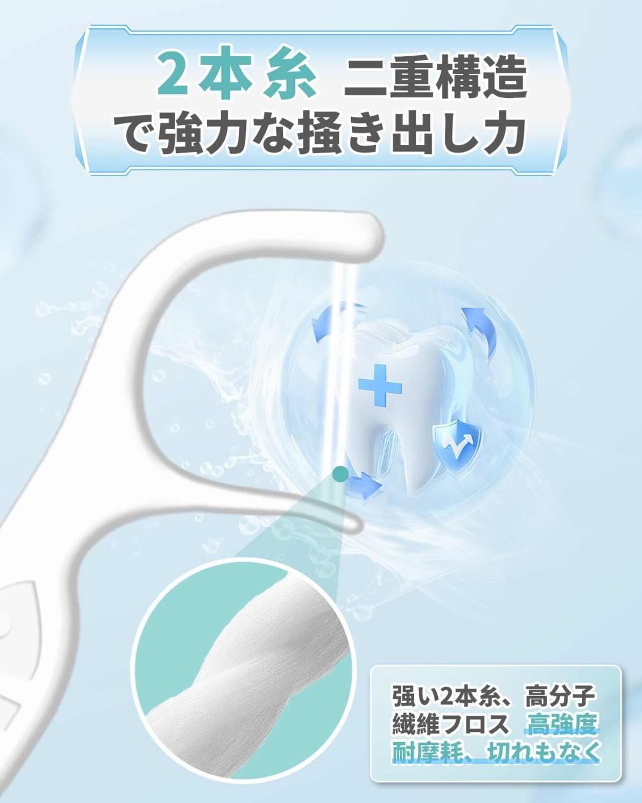 【高強度フロスで切れにくい】ポリエチレン素材のデンタルフロス、糸自体の強度も十分あるので簡単に千切れたりはしませんでした。ワイヤー矯正中の狭い隙間にもスムーズに挿入可能でありながら、引っ張りや摩擦に非常に強く、ほつれ・切断が起きにくい設計です。