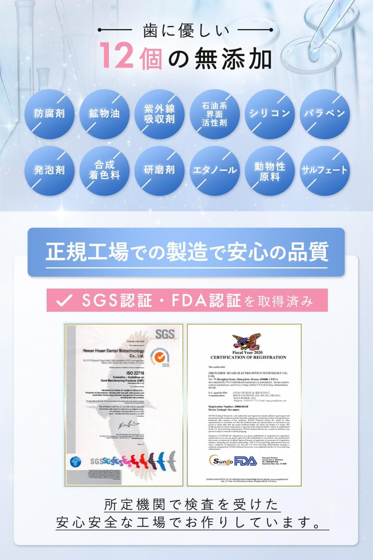 【正規工場での製造】SGS認証とFDA認証を取得した工場で製造。徹底した品質管理のもと、安全性の高い製品をお届けします。