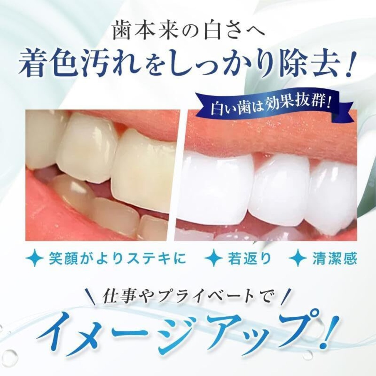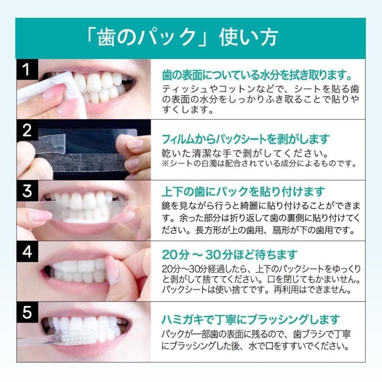 【使用方法】1.シート粘着面を、上の歯、下の歯にそれぞれ貼り付けます。2.しばらくそのまま時間を置きます。3.シートを剥がし、歯ブラシでよくブラッシングしてください。その際、お手持ちの歯磨き粉をご使用いただいても結構です。その後は口をよくすすいで、完了です。