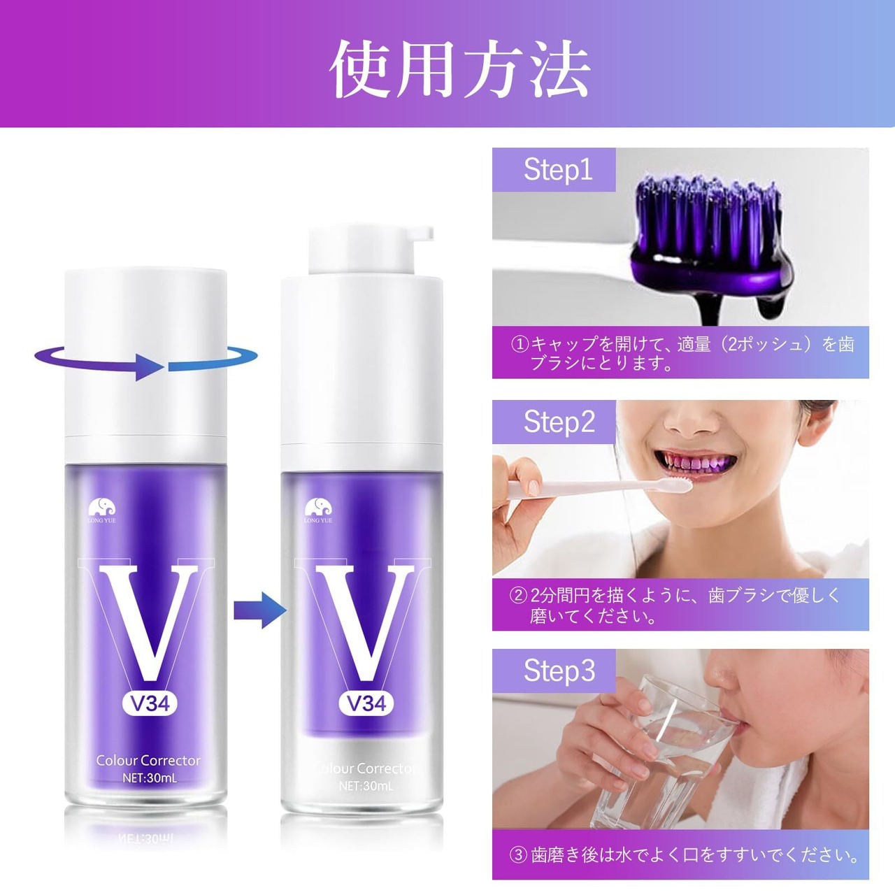 使用方法: 1・本製品ホワイトニングジェルv34のキャップを開けて、適量毎回に2プッシュを歯ブラシに取ってください。2・普通の歯磨き粉ような使用して、2分間ぐらい歯ブラシで磨いてください。3・歯磨き後、水でよく口をすすいでください。4・そして終わってから、しっかりキャップを閉めてください。