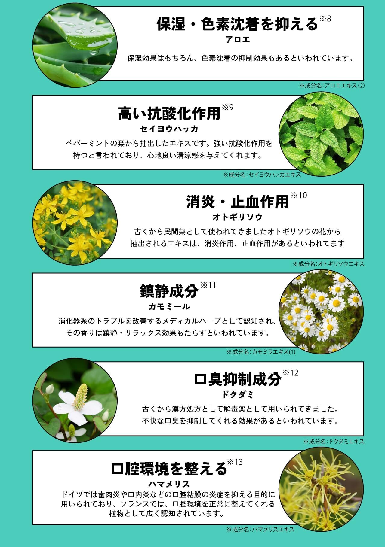 商品特長 ステイン除去, プラーク除去, ホワイトニング※ブラッシングによる効果, 低刺激性, 口臭除去, 抗菌