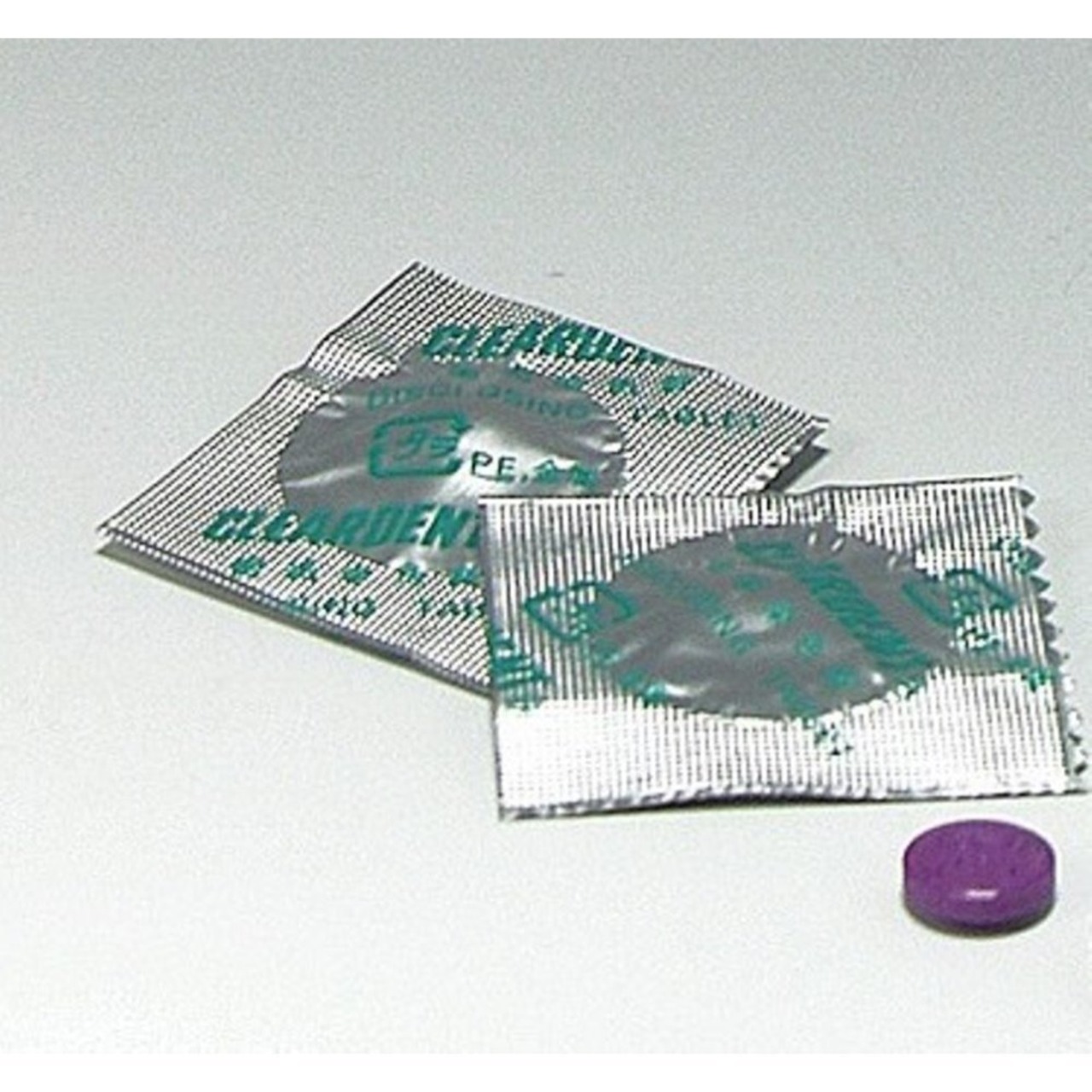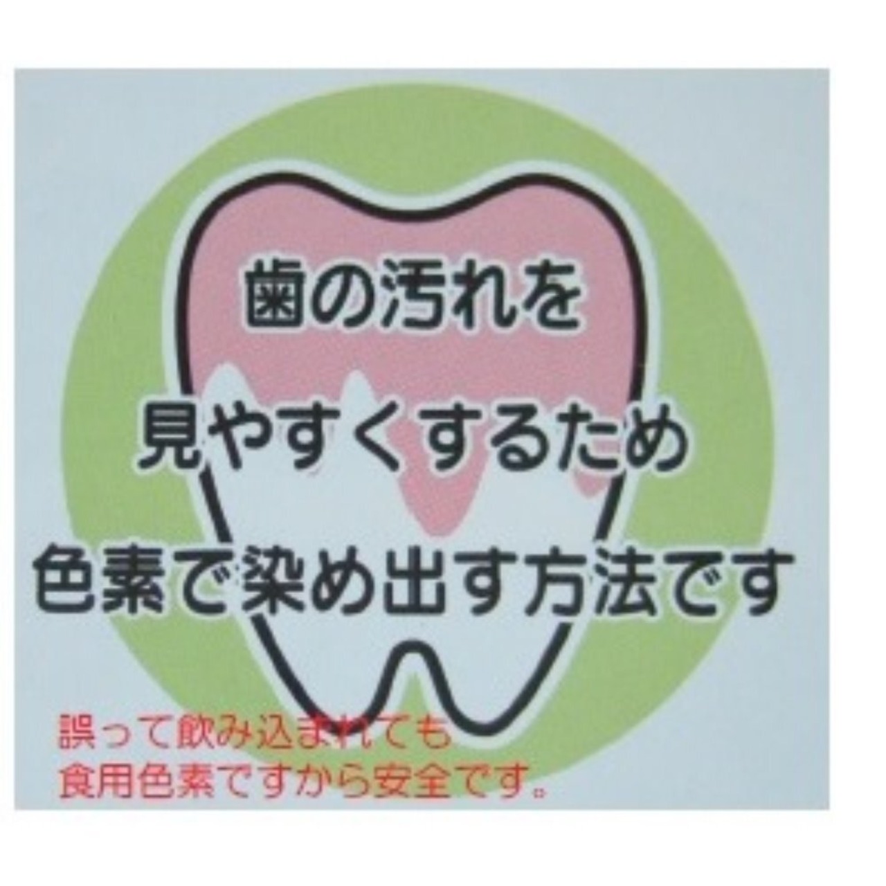 そのままでは見えにくい歯垢に色(赤色)をつけて磨き残しをチェックする錠剤です。そのままでは見えにくい歯垢を染め出して除去しやすくするための錠剤です。歯科検診でも使われている歯垢の染め出して定期的にチェックします。錠剤(1錠)を噛み、舌で歯にのばして赤く染めます。唾液とともに吐き出します。うがいの必要はありません。歯垢が付いている部分が赤く染め出されますので、出来るだけ早く鏡などでチェックします。赤く染め出された部分は、歯垢が付着しやすいが磨き残しの部分ですので、そこを丁寧に磨きます。