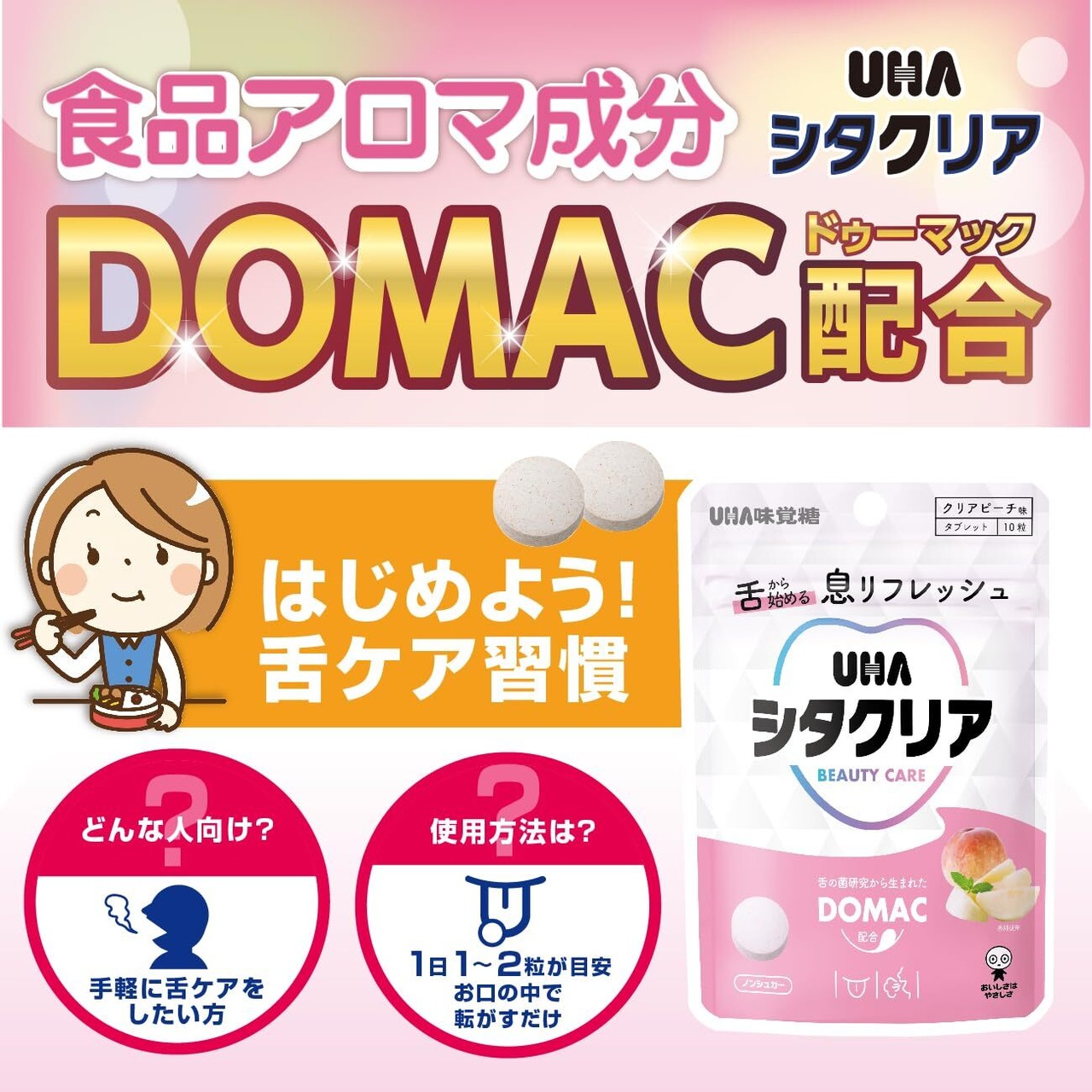 舌の菌研究から生まれたオリジナルの複合成分「DOMAC」を配合したタブレットです。クリアピーチ味(ノンシュガータイプ)です。UHAシタクリア液体はみがきの試供品が付きます。