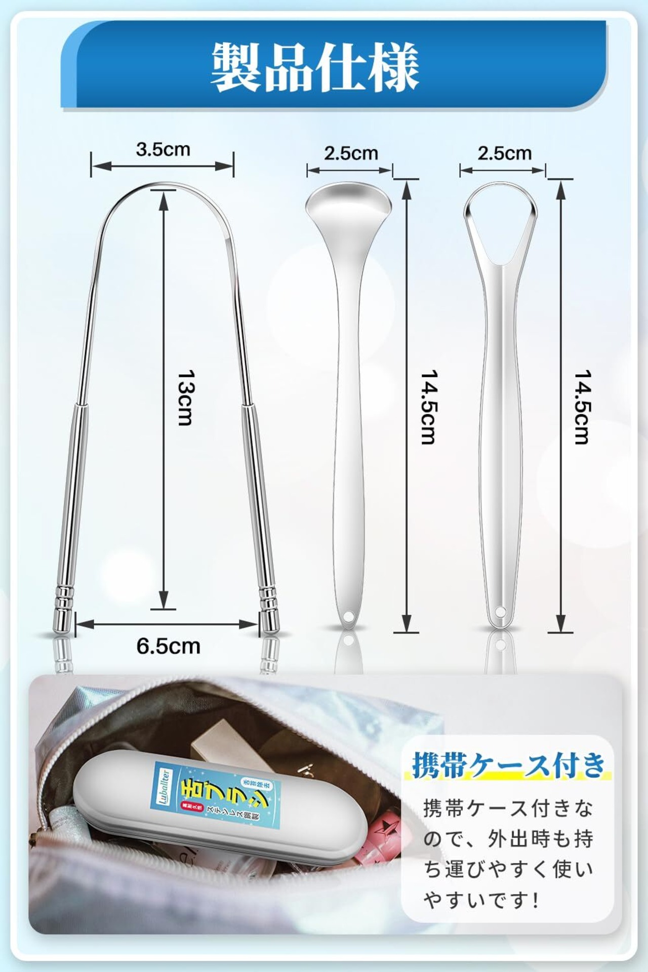 舌ブラシ仕様:3本セット(U字型、開口タイプ、スプーン型) 3種類 舌クリーナーあるので家族で使えます。1セットで3種類のスクレーパーが付属されますのでお好きなのを使われる!収納ケース付、旅行や出張にも携帯便利です。