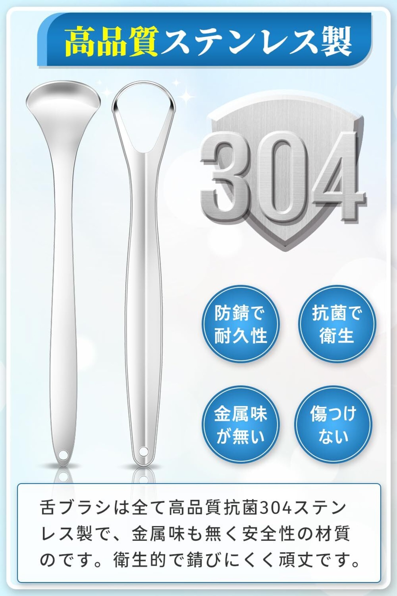 高い耐久性 304ステンレス製:舌ブラシは全て304ステンレス製で、衛生で錆びにくく頑丈です。金属味が無い、傷つけない、エヅくこともなくまた金属の質感もよく快適に舌掃除が出来ます。舌苔が綺麗に除去できます。錆びないし、水洗いして歯ブラシと一緒に置いておけるのでその点でも手軽に使えてます。