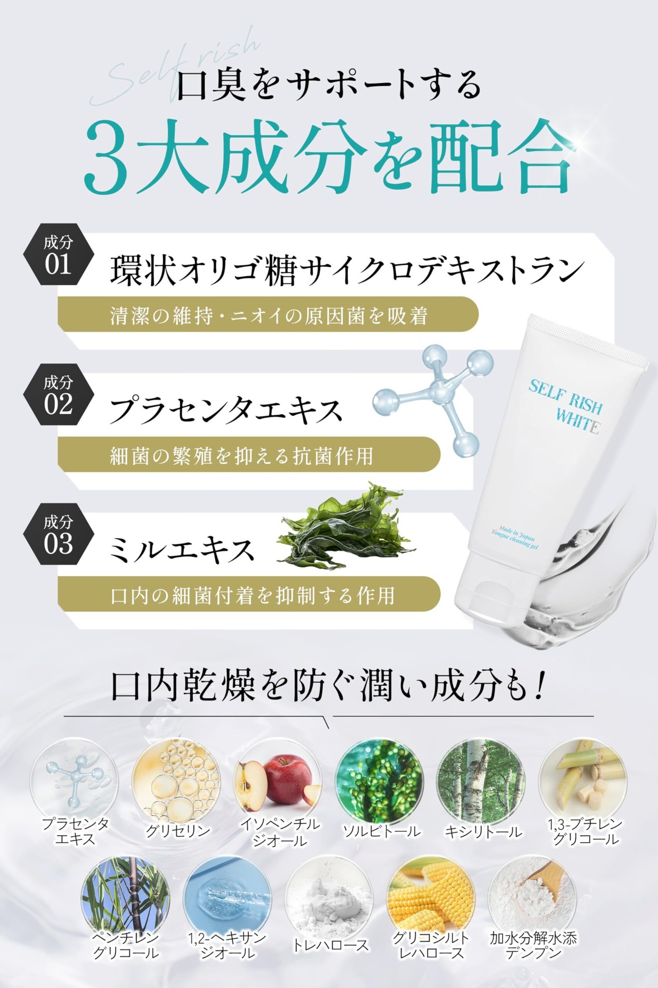【口臭をサポートする3大成分と潤い成分を配合】口臭をサポートする3大成分と口内乾燥を防ぐ潤い成分を配合し、お口の中をサポートします。■成分01:清潔の維持・ニオイの原因菌を吸着する環状オリゴ糖サイクロデキストラン ■成分02:細菌の繁殖を抑える抗菌作用のプラセンタエキス ■成分03:口内の細菌付着を抑制する作用