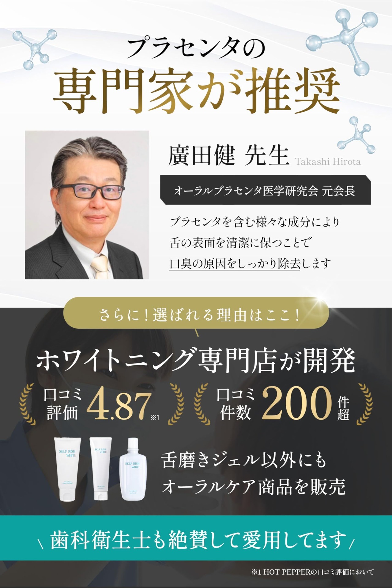 【HOT PEPPER口コミ評価4.87※】セルフホワイトニング専門店のSELF RISHがプロデュースしたミントフレーバー風味の舌磨きジェルです。舌に優しいフリー処方なので、初めての方にも使いやすい商品です。※集計期間:2021年4月1日〜2023年12月10日