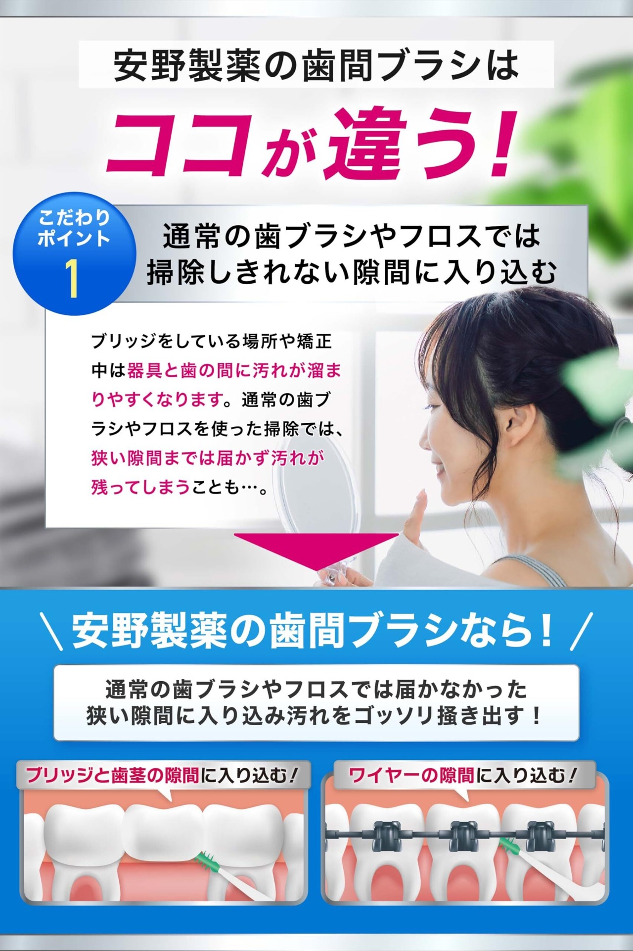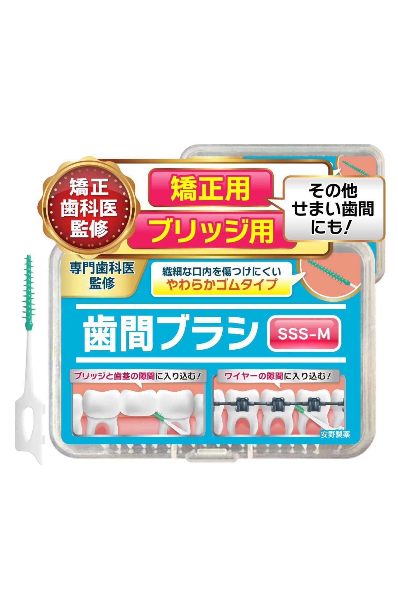 【矯正用 ブリッジ用】 矯正 や ブリッジ をしてると矯正器具の隙間、歯と歯の間、歯茎との隙間の掃除がうまく出来ず苦労されると思います。この器具周りブリッジ周りをうまく掃除が上手くできないと、矯正の遅延や周りの範囲にも影響が広がっていく原因となることもあります。 矯正用フロス ・ ブリッジ用フロス のトップメーカーである安野製薬がお客様のお声を受け矯正・ブリッジ・インプラントの方向けに、狭い隙間でも掃除 ができる歯間ブラシ製品を開発しました。この しかんブラシ は先端を細く柔らかなゴム素材にすることにより、通常はフロスが入りにくい、隙間を器具や歯、歯茎を傷つけることなく掃除をすることが出来ます。