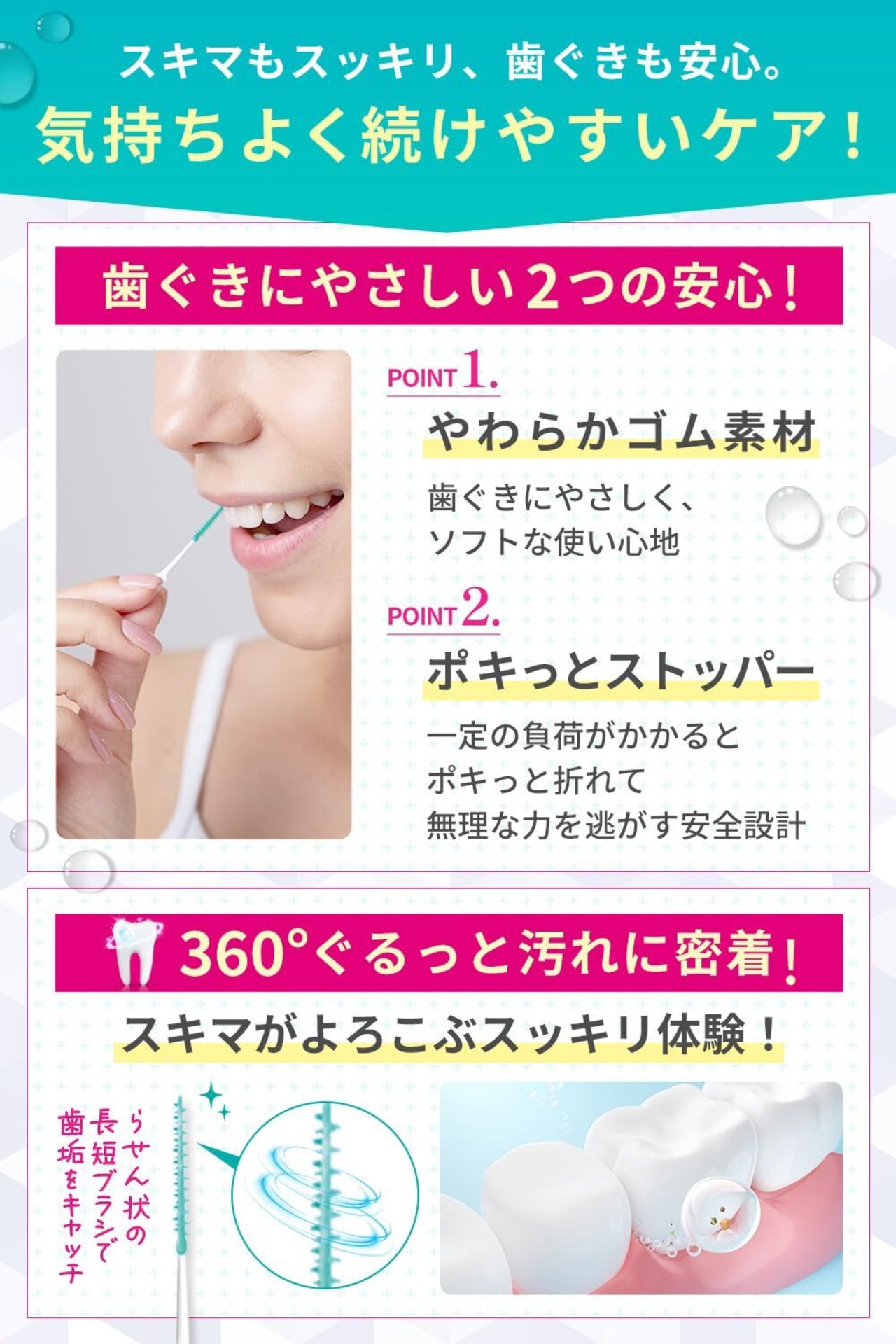 【折れることで守る、ストッパー構造】なぜ歯ぐきが傷つくのか?実は“力のかけすぎ”かも。一定以上の力がかかると折れてくれる構造で、歯ぐきに負担がかかりにくく安心です。