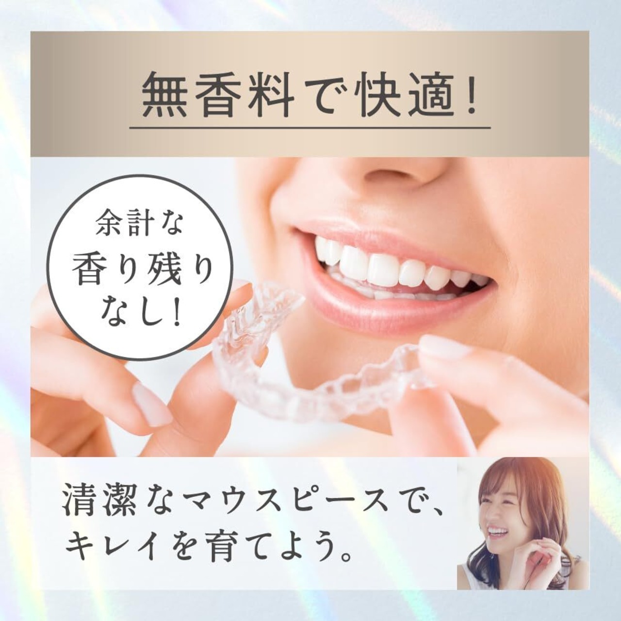 歯列矯正者のためのマウスピース用泡ウォッシュ わずか5分で 99.9%除菌※+ヌメリ**・ニオイ・着色汚れ除去 泡×独自洗浄技術BPT バイオフィルム・ピーリング・テクノロジー 密着泡が落ちにくい汚れを丸ごとつるりと剥がします **バイオフィルム(菌の集合体) ※すべての菌を除菌するわけではありません。