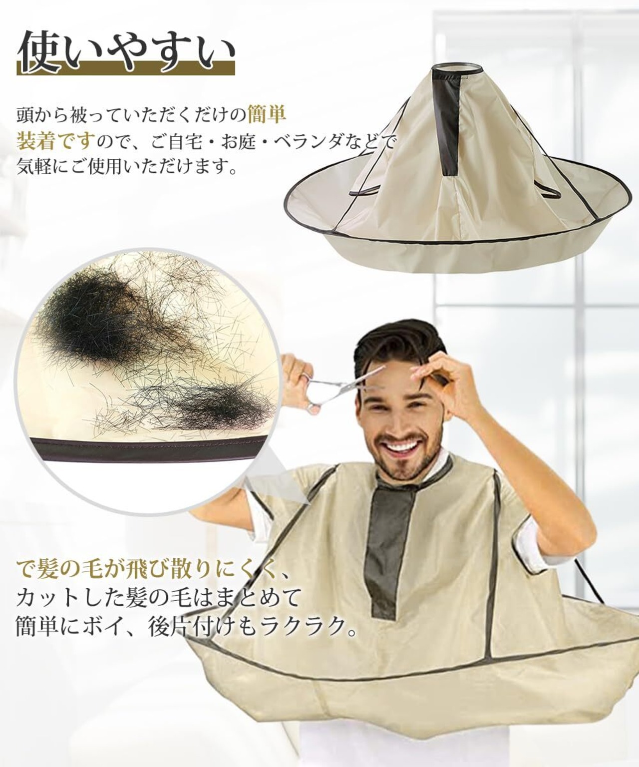 使いやすい:おうちでのヘアカットに 便利な散髪用ケープ。頭から被っていただくだけの簡単装着ですので、ご自宅・お庭・ベランダなどで気軽にご使用いただけます。
