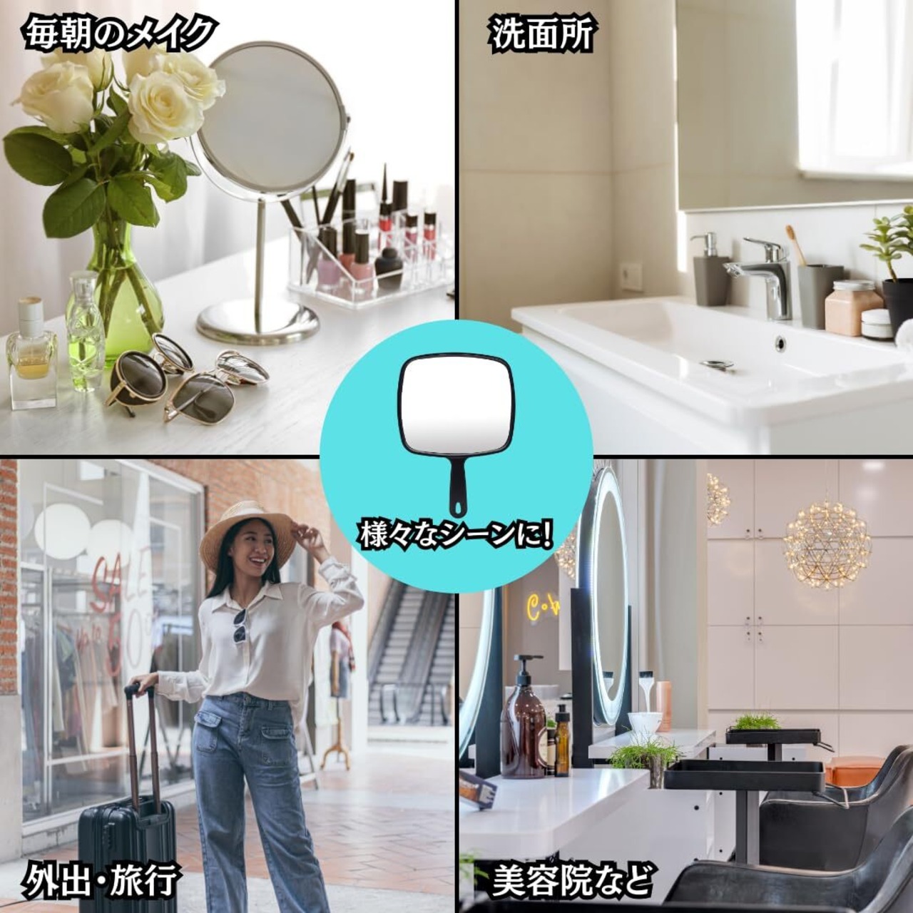 【大きく見やすいハンドミラー】お化粧の際に活躍する、大きい・見やすい・持ちやすいハンドミラーです。使いやすく実用性の高いハンドミラーですので、ご自宅でのメイクやスキンケアはもちろん、外出先や理髪店・美容院などでもお使い頂く事が可能です。