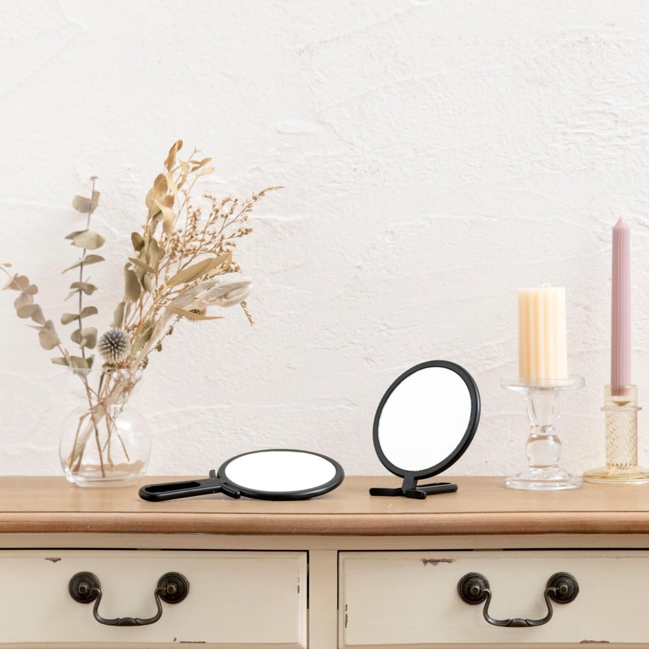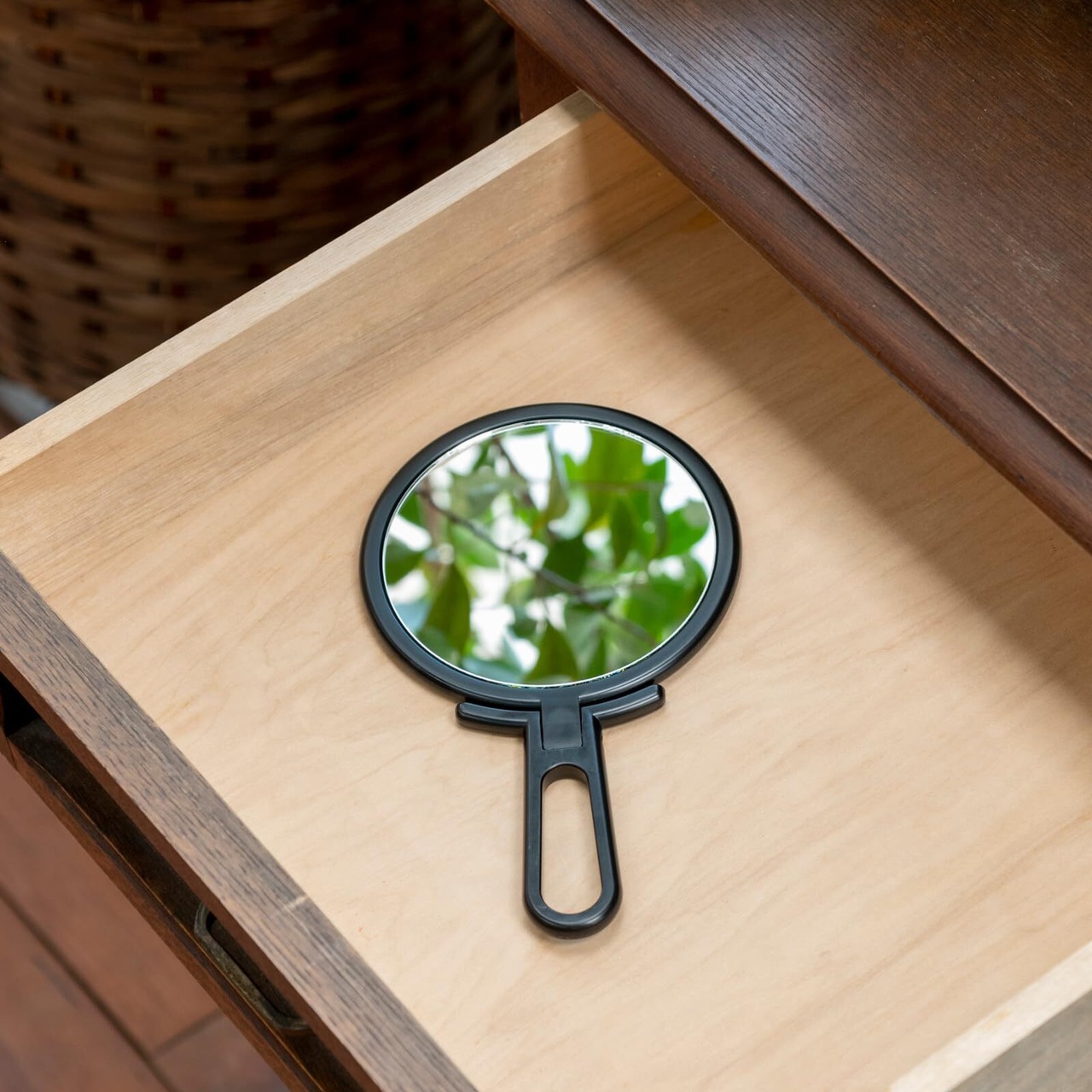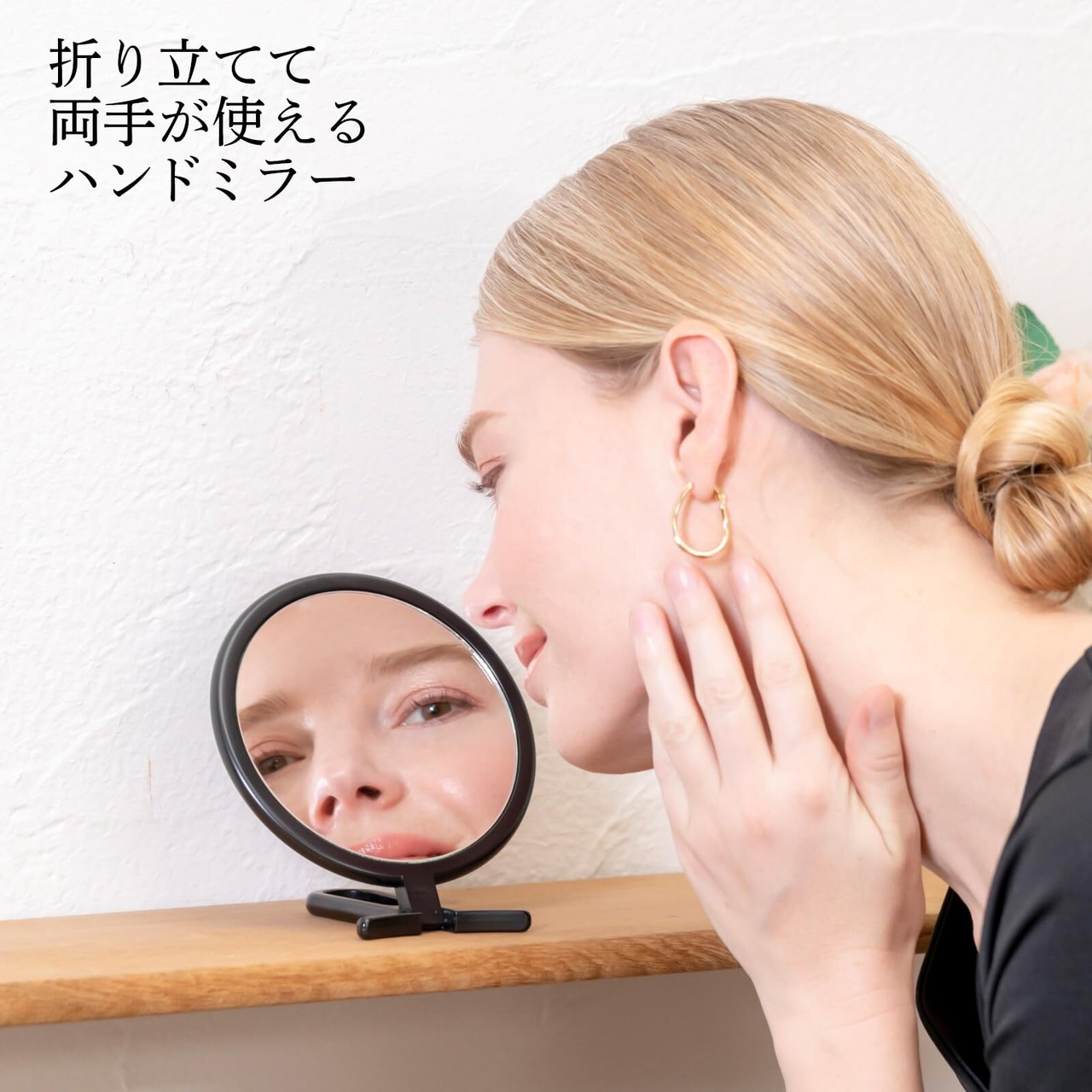 【便利な折立ハンドミラー】手鏡として十分な大きさで、必要な部分をしっかり写すことができます。またハンドル部分を折り立てて、鏡を立たすこともでき卓上ミラーとしても使用できます。