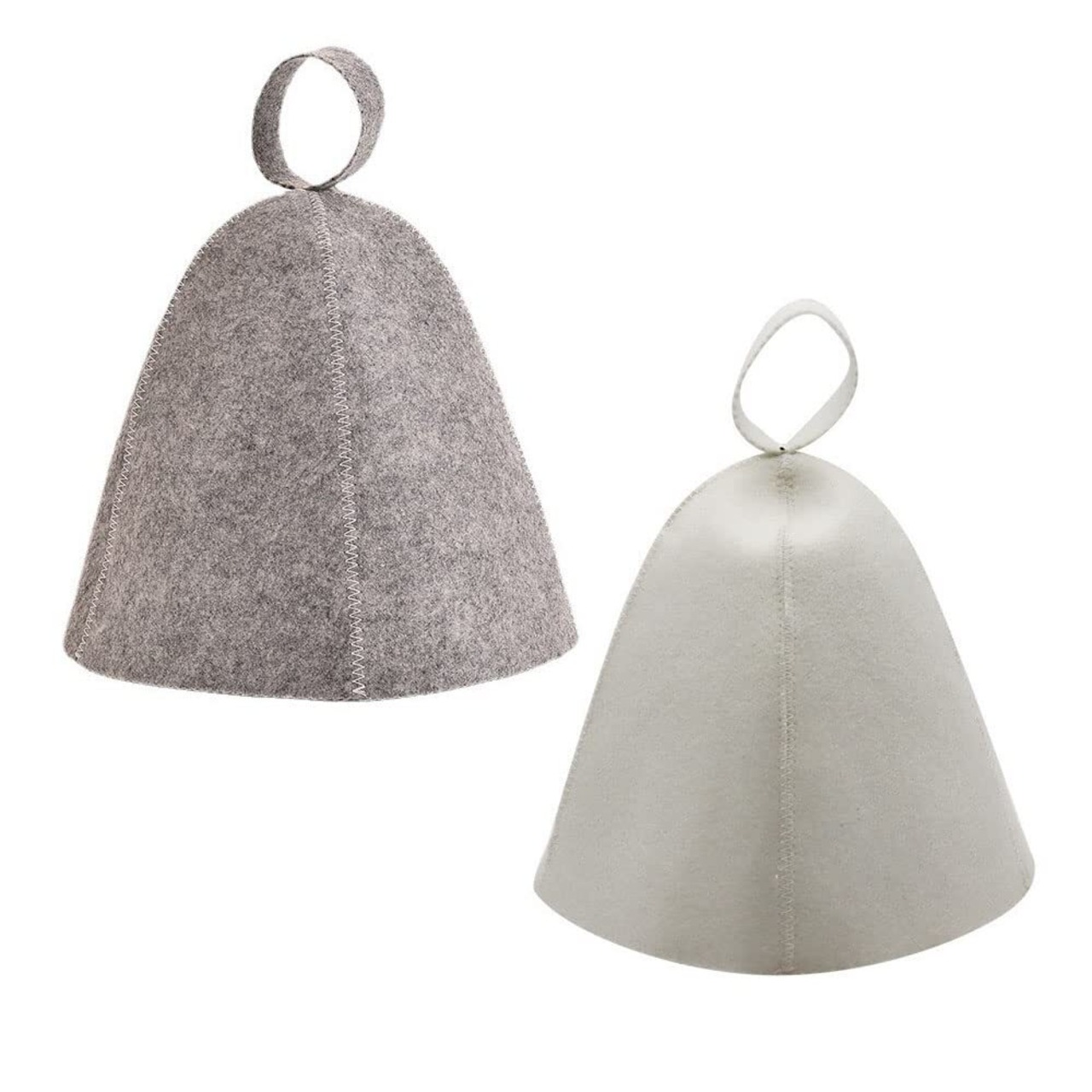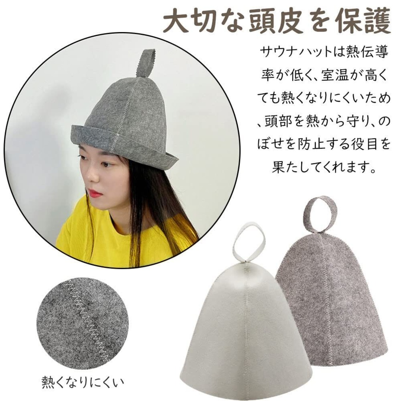 【商品仕様】パッケージ内容:サウナハット 2枚入り サイズ:フリーサイズ カラー:ホワイト、グレー メイン素材: フェルト、熱くなりにくい、抗菌・消臭効果、シワになりにくい。