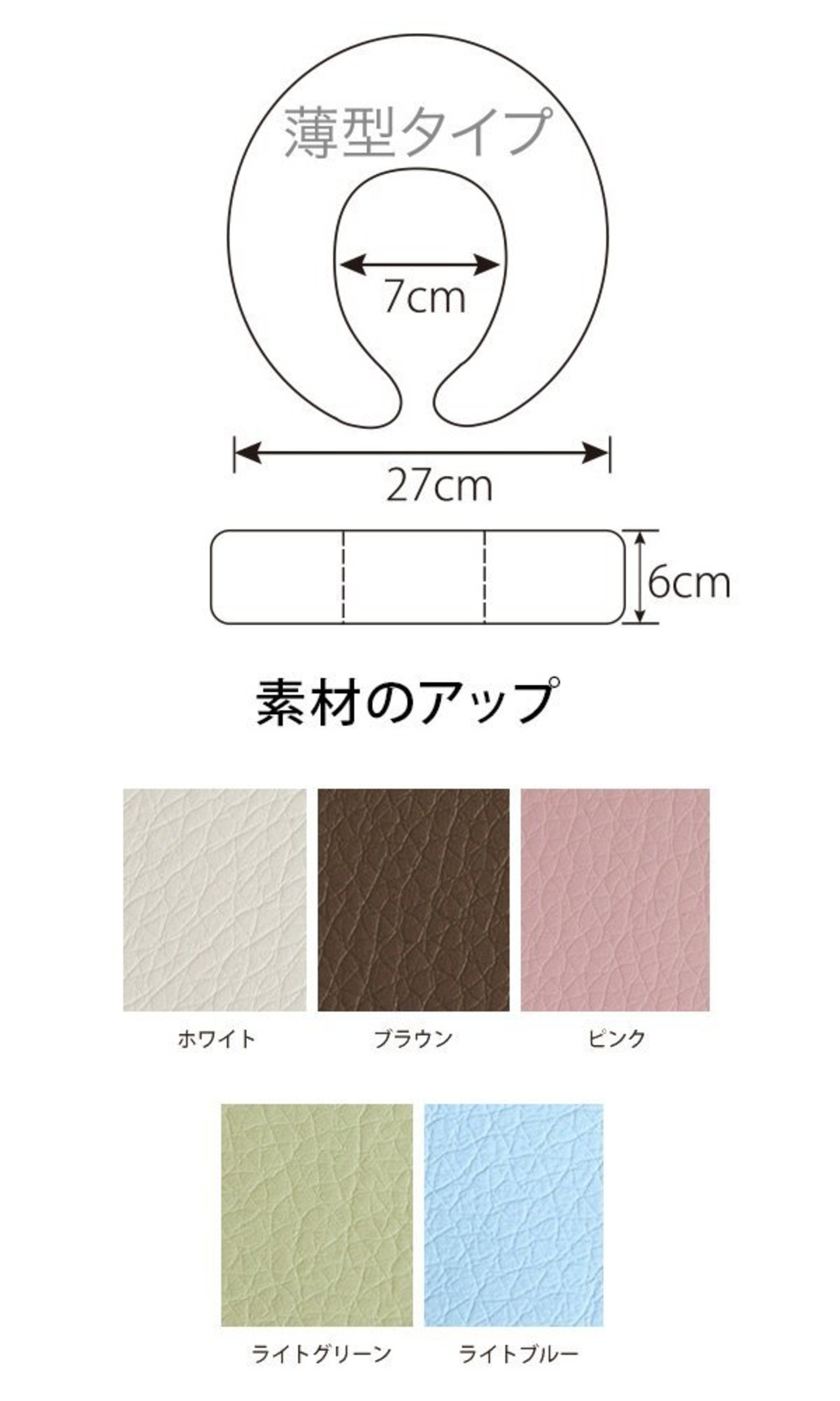【仕様】■サイズ:高さ6cm×直径27cm、穴サイズ:幅最大7cm×奥行17cm ■生地素材:ビニールレザー ■カラー:ピンク(10711)、ライトブルー(10712)、ライトグリーン(10713)、ホワイト(10714)、ブラウン(10715)【お手入れ方法】レザー製品のお手入れは、柔らかい清潔な布でこまめに乾拭きしてください。また、洗剤には市販の専用クリーナー、またはぬるま湯で薄めた中性洗剤をご使用ください。(アルコール等は使用不可)