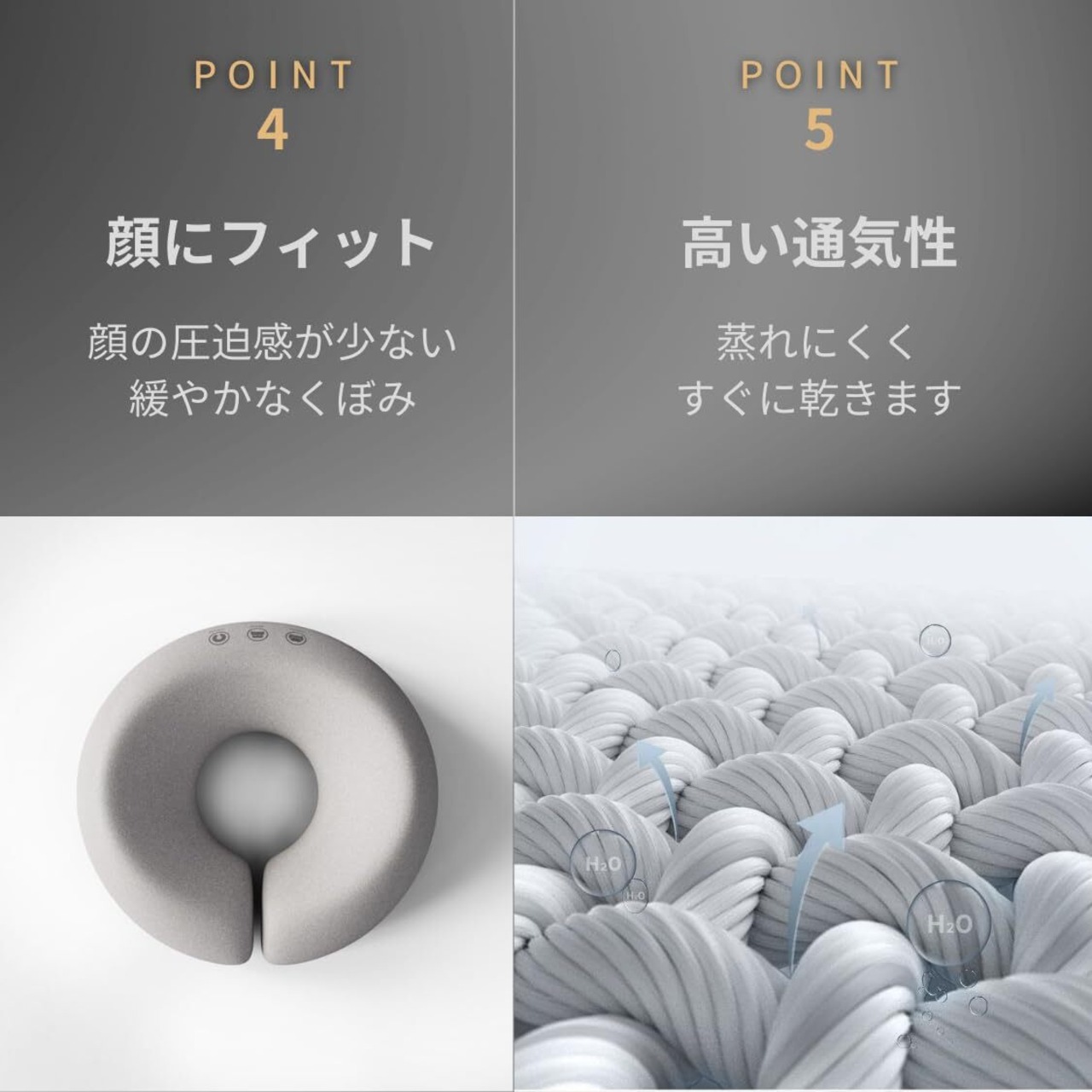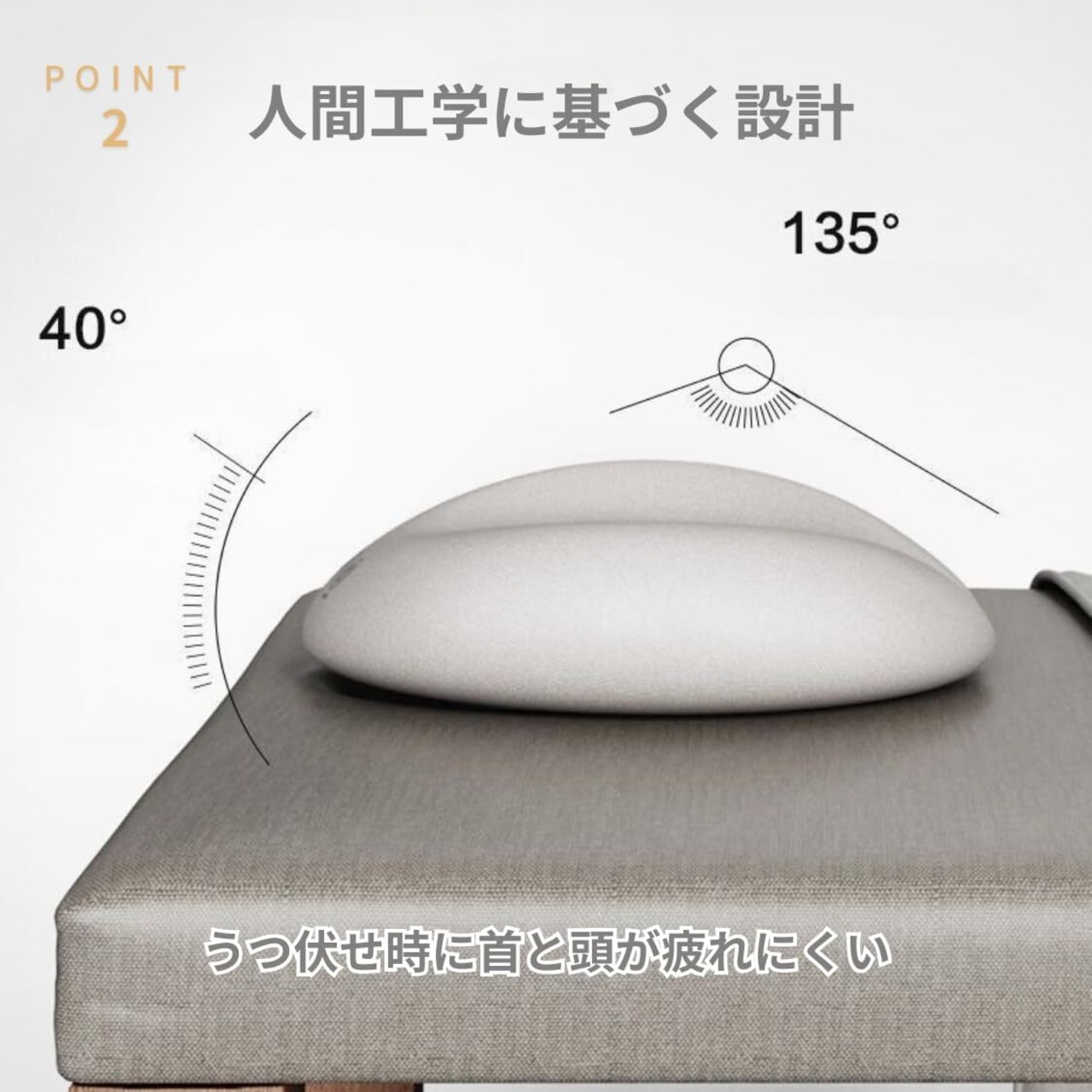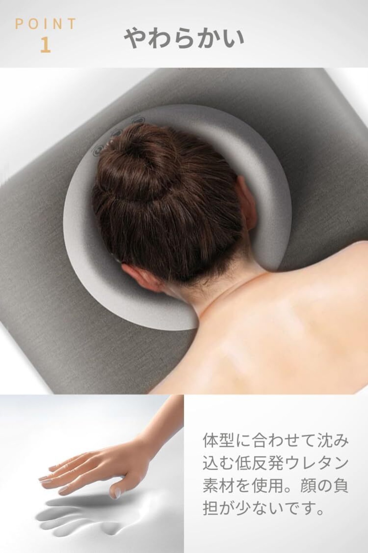 やわらかく体型に合わせて沈み込む低反発ウレタン素材を使用し、顔の負担が少ないです。