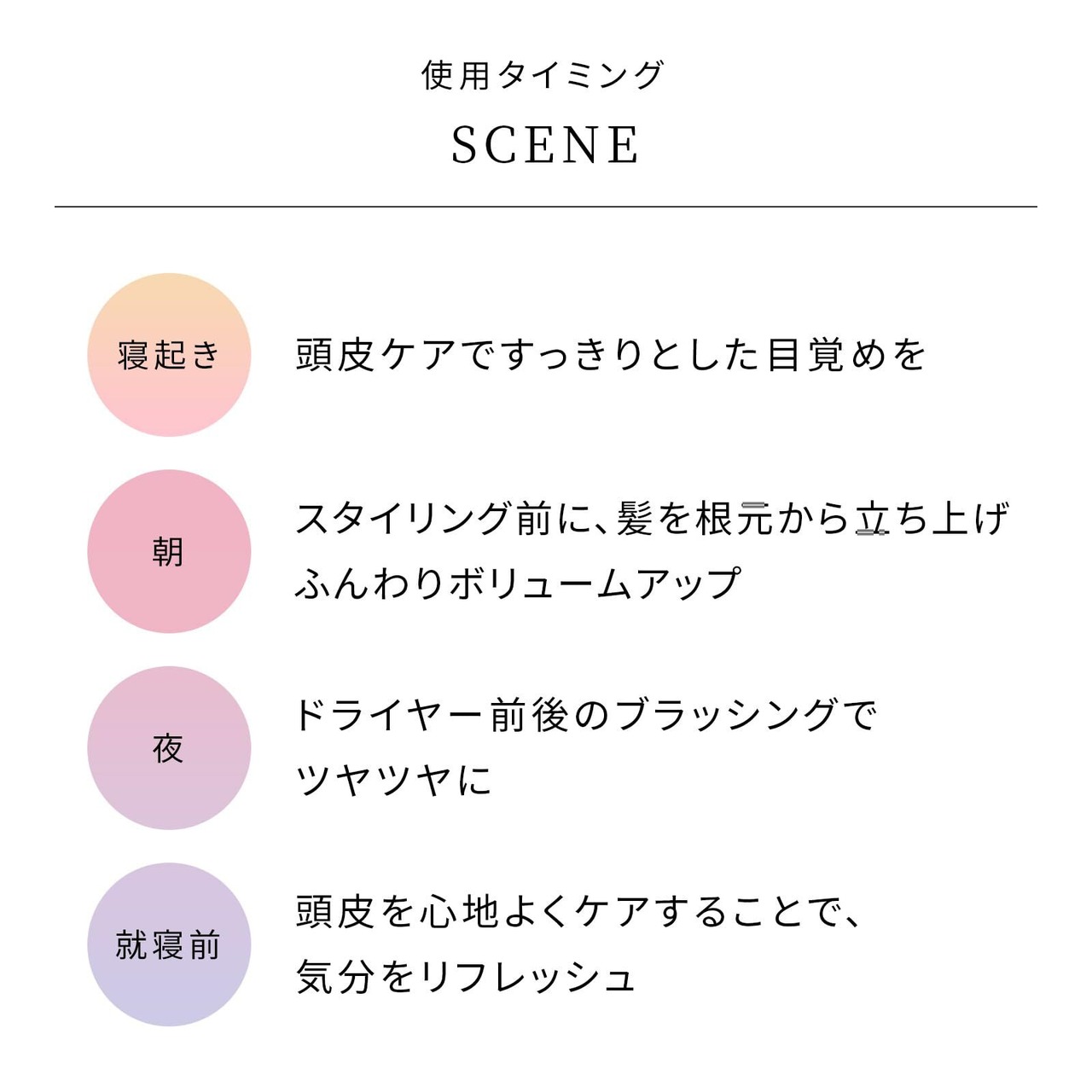 【心地よさを叶えるピン】スムーズなブラッシングを叶えながら、髪の根元にくまなく刺激を与えられる間隔でピンを配置。また、帯電防止剤配合で静電気を軽減します。