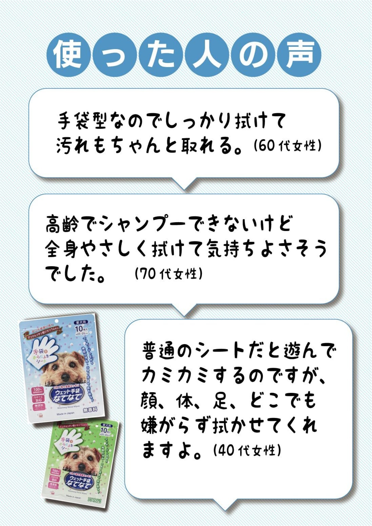 手袋を奥まで装着しペットを全身なでなでしながら汚れをふき取って下さい。