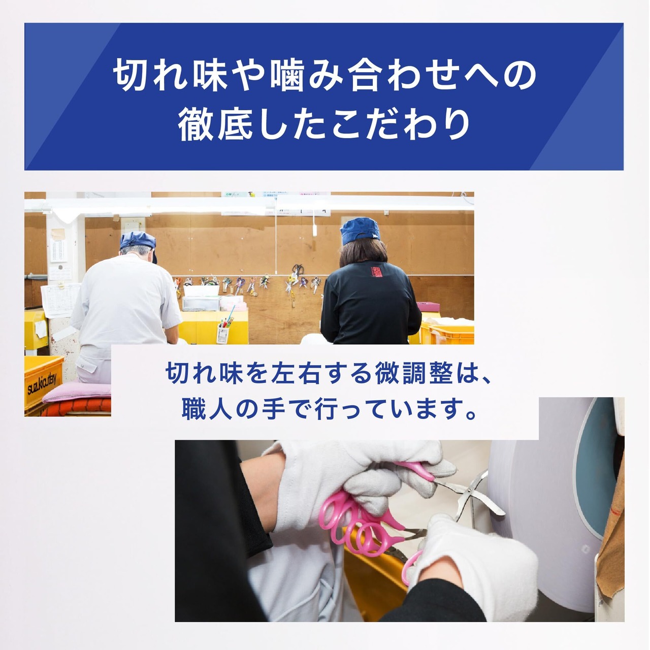 【切れ味やかみ合わせを追求】小さいながらも使い心地のよい切れ味にするため、ハサミの刃には専用の砥石を使っています。人の手によってミクロン単位まで調整を施すことで、しっかりと噛み合う開閉具合、眉毛カットに適した刃の薄さ・角度を叶えました。