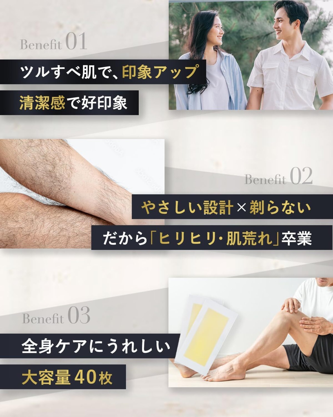 【全身に使える1パック40枚入りの大容量】 ワキ・腕・脚・背中・Vラインなど広範囲に対応。大容量40枚入りなのでコスパが良く、繰り返し使えるのも嬉しいポイント。1枚ずつ個包装されているため衛生的で持ち運びにも便利。