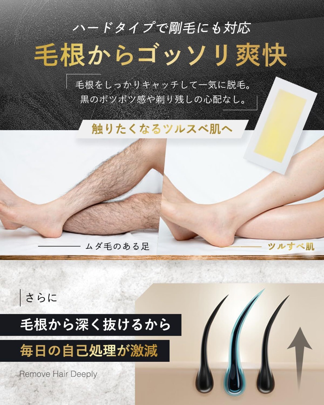 【ムダ毛ケア後もすべすべ肌キープ】 毛を根元からしっかり取り去ることで、表面だけの処理よりもすべすべ感が長続き。肌への刺激も少なく、専用シートでワックスの残りもすっきり。使用後もさらっと心地よい肌をキープできます。