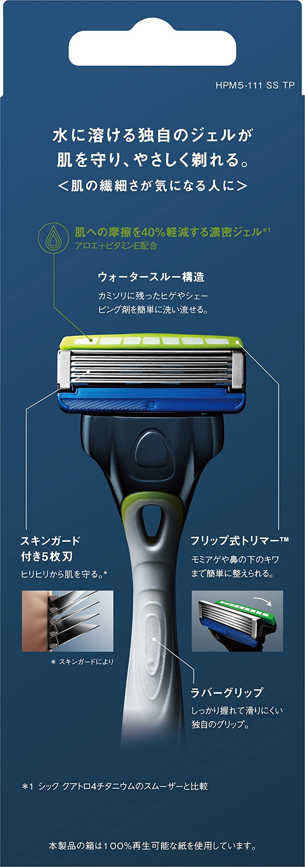 ●男の肌に極めた剃り味*1 ●濃密ジェルが摩擦から肌を守る“シックハイドロ5プレミアム"シリーズから、敏感肌用が登場。 アロエ&ビタミンE入り配合。皮膚科医のテスト済み。(すべての方に刺激がおきないというわけではありません) ●通常のスムーザーとは異なる*2「ハイドログライドジェル」を搭載。剃るたびに、滑りをよくして肌を守る。 *1シック史上、*2シックカミソリと比較(ハイドロを除く) ●スキンガード付き5枚刃が肌の動きをコントロールして摩擦を軽減。 ●フリップ式トリマー仕様で、剃りにくいもみあげのキワも、ワンタッチで簡単に剃れる。