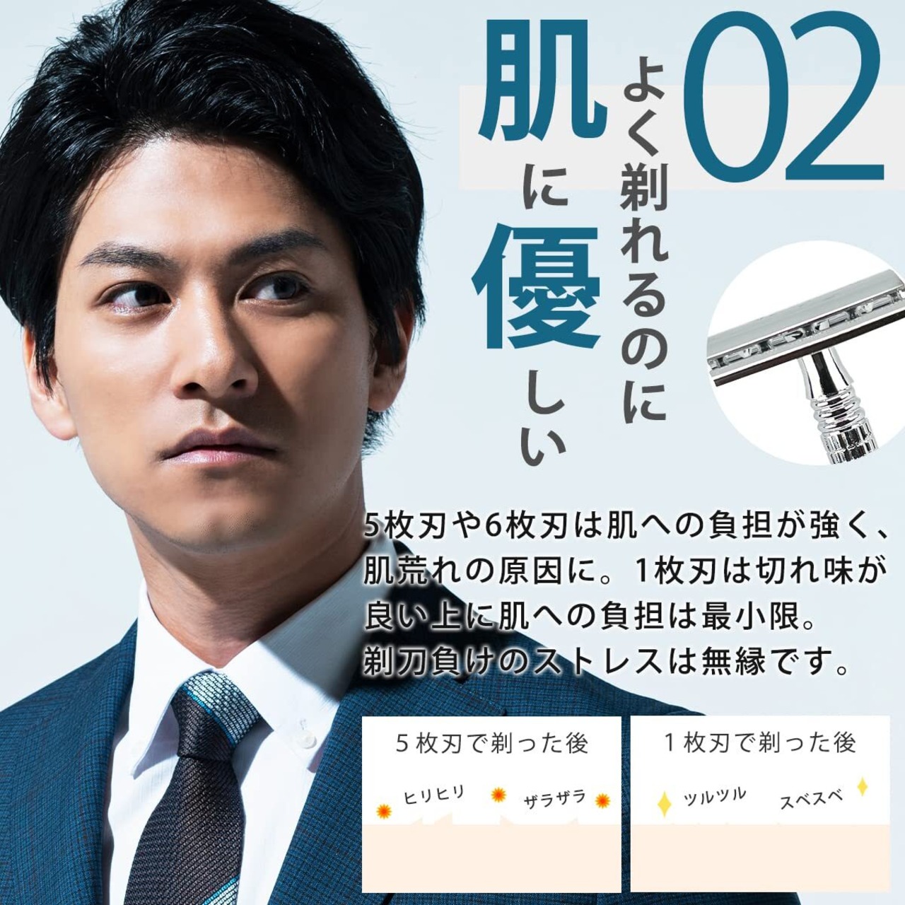 【T字カミソリ以上】5枚刃や6枚刃より肌への負担が少ない。かみそり負けもしにくいですが、切れ味は抜群です。とても丈夫な防水合金製ですので、長く愛用頂ける一品です。