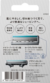 ●チタニウム*、鋭い切れ味、長続き*チタンコート刃 ●セーフティーワイヤー付きチタンコート4枚刃。 ●ホホバオイルアロエビタミンE配合のスムーザーが、刃のすべりを滑らかにし、剃り心地を快適に。大型ガードバーが肌をのばし、ヒゲを剃りやすい状態にします。 ●キワを整えるデザインカッター付。
