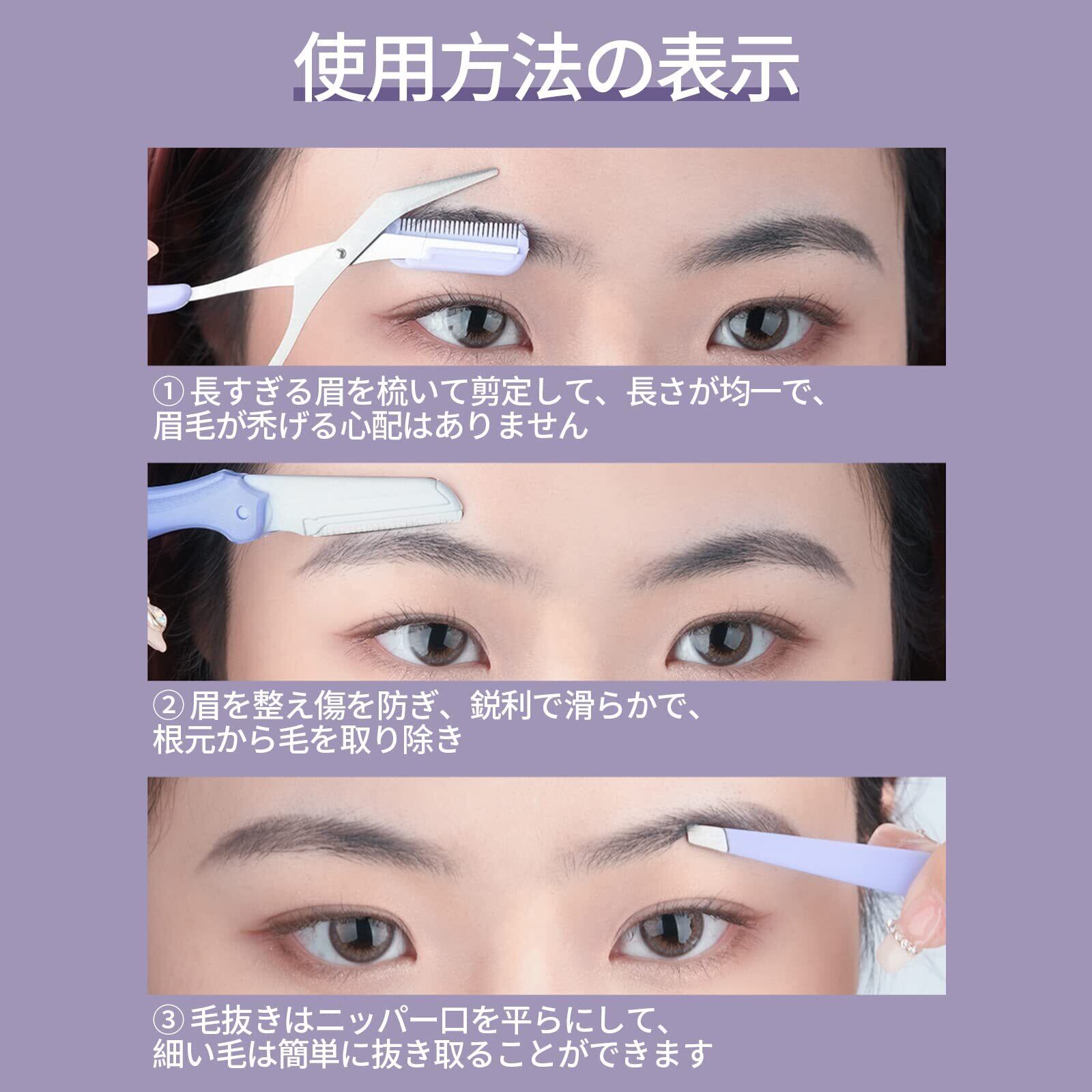 【初心者に最適】眉毛剃りは0.1 mmマクロブレード、眉を整え傷を防ぎ、鋭利で滑らかで、根元から毛を取り除き、根元に黒点がなく。眉毛 はさみは取り外し可能な眉櫛を持参し、毛をきれいに切って、長すぎる眉を梳いて剪定して、長さが均一で、眉毛が禿げる心配はありません。毛抜きはニッパー口を平らにして、細い毛は簡単に抜き取ることができます、0.1 MM精確閉口、緊密不断毛、抜毛による疼痛感の減少。初心者でも使い易く。